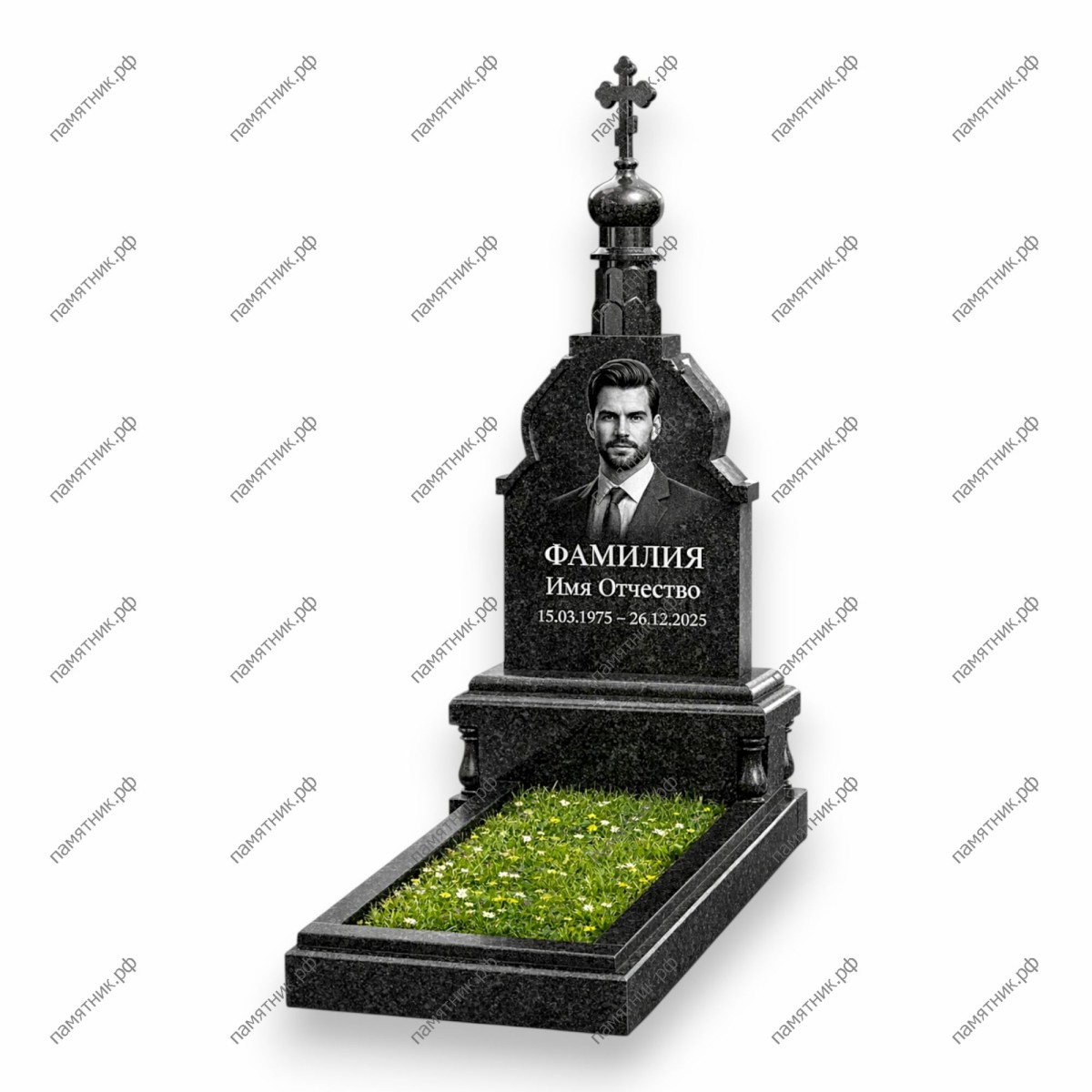 Изящный памятник с фигурным завершением. Верхняя часть стелы выполнена в виде плавных архитектурных сводов, которые венчает резной купол с православным крестом. Эта модель сочетает в себе традиционные религиозные мотивы и мягкость линий, выражая светлую память об усопшем.