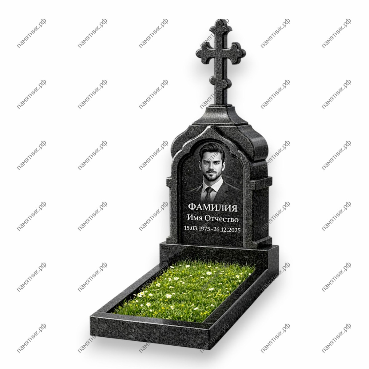 Впечатляющая модель с массивным фигурным сводом, состоящим из нескольких плавных уровней. Венчает композицию крупный, детально проработанный православный крест, установленный на широком основании. Памятник отличается визуальной мощью, надежностью и лаконичной солидностью.