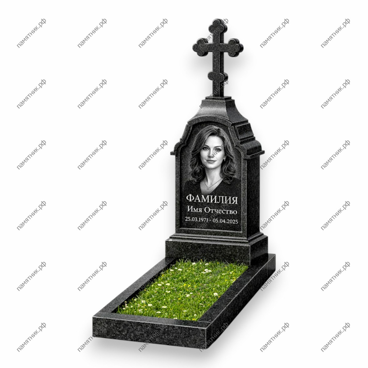 Монументальная модель со ступенчатым арочным карнизом, который придает стеле дополнительный объем и выразительность. Широкое основание плавно сужается кверху, завершаясь крупным крестом. Пропорции памятника создают гармоничный баланс между строгостью гранита и изяществом резьбы.