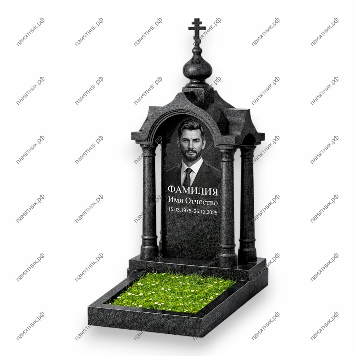 Торжественная модель, стилизованная под часовню. Стела обрамлена резными барельефными колоннами и глубоким арочным сводом, создающим эффект ниши для портрета. Венчает композицию классический храмовый купол с крестом. Массивная и статусная форма памятника символизирует духовную защиту.