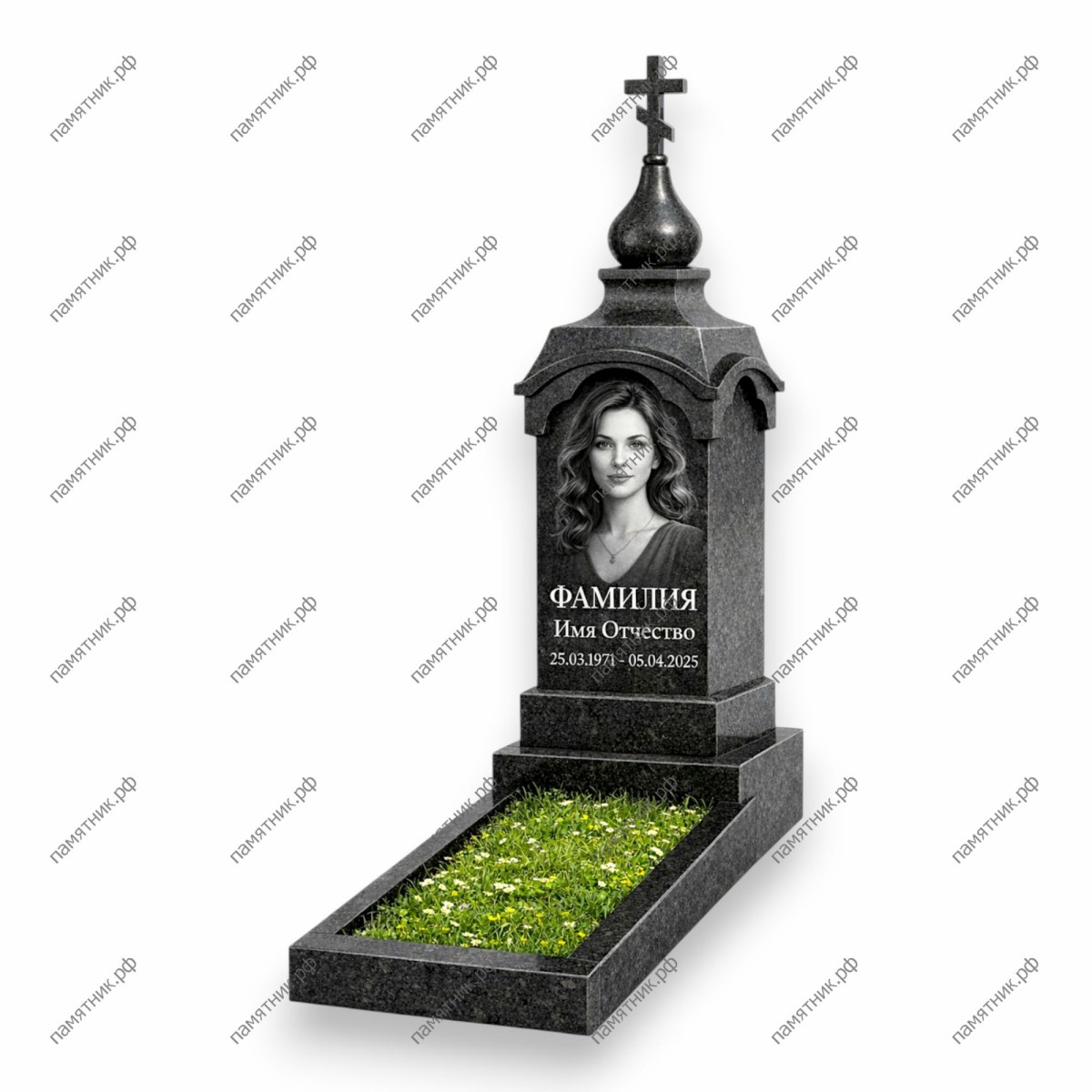 Строгая стела, украшенная сверху резным элементом, имитирующим двускатную крышу часовни. Этот архитектурный прием символизирует дом для души. Венчает «крышу» аккуратный купол с крестом. Четкая геометрия и прямые боковые грани делают модель универсальной и солидной.