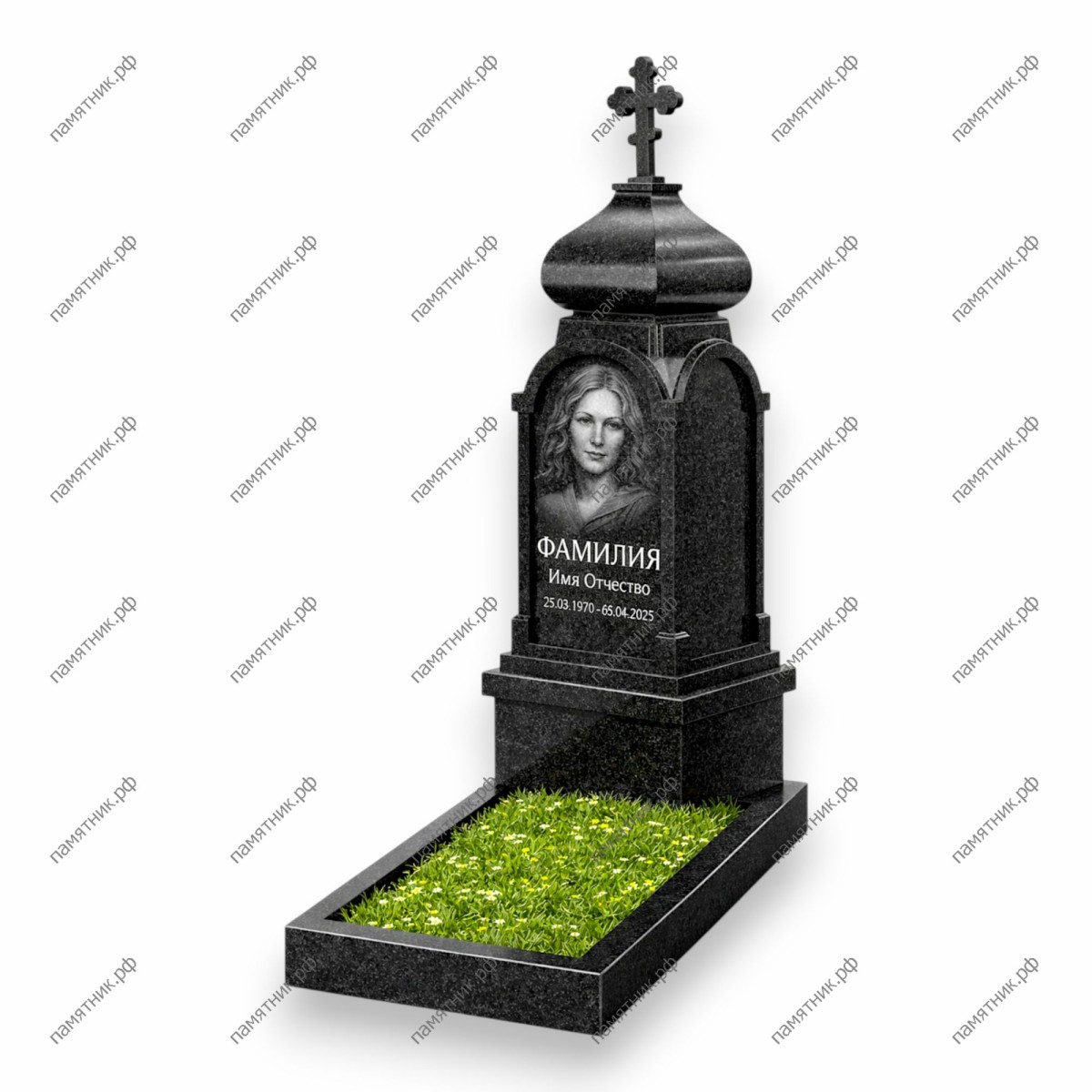 Величественный памятник-часовня со сложной детализацией. Зона гравировки утоплена в глубокую арку, обрамленную прямыми сводами. Главным акцентом композиции является массивный, идеально отполированный купол-луковица, служащий основанием для креста. Этот дизайн глубоко символичен и передает образ настоящего православного храма.