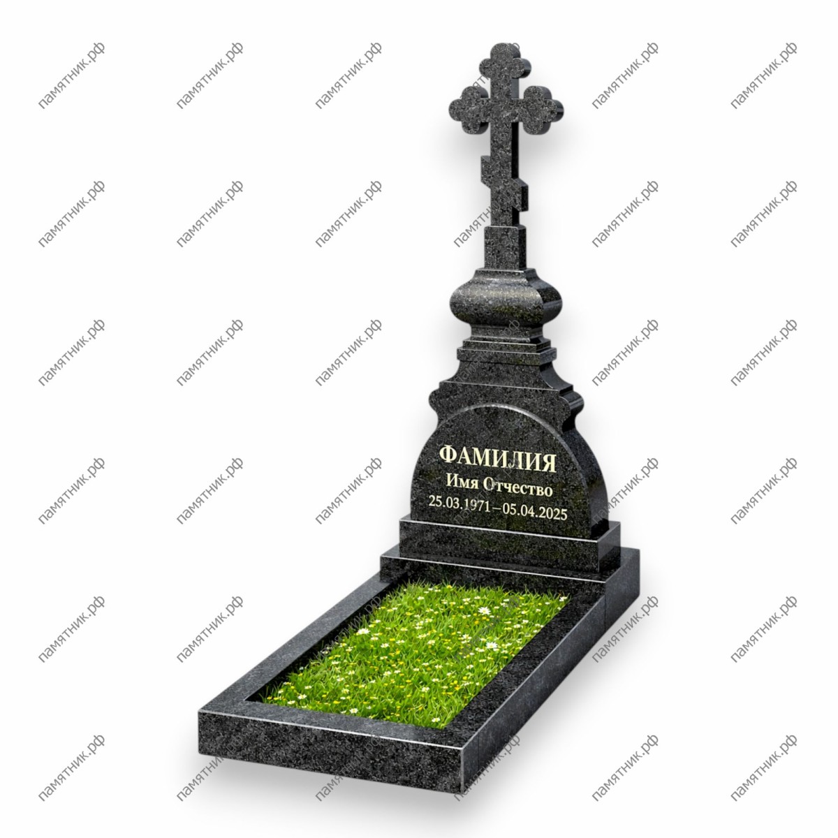 Нестандартная и высокохудожественная модель, предназначенная для текстового оформления (без гравировки портрета). Широкое, куполообразное основание стелы служит полотном для нанесения эпитафии и ФИО (например, сусальным золотом или глубоким скарпелем). Над основанием возвышается сложный, многоярусный точеный постамент, увенчанный массивным крестом-трилистником.