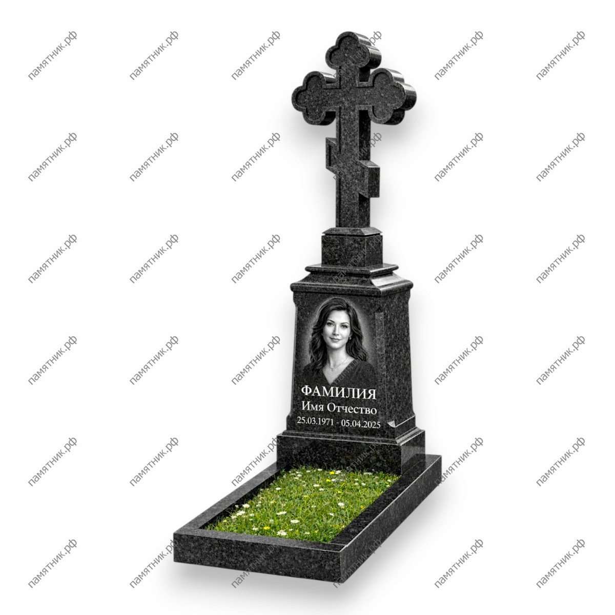 Изысканная стела, слегка сужающаяся кверху, дополнена массивным архитектурным карнизом. Главным украшением модели служит роскошный резной крест-трилистник (с окончаниями в виде трилистника), установленный на многоуровневом постаменте. Модель сочетает в себе место для крупного портрета и богатство художественной резьбы по камню.