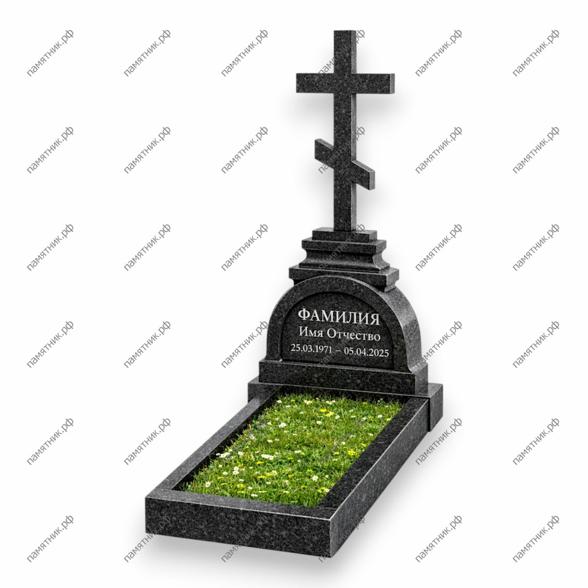 Нестандартная и лаконичная Голгофа, предназначенная только для нанесения текста (без гравировки портрета). Основание стелы выполнено в форме низкого полукруглого свода. Из центра арки вырастает красивый ступенчатый постамент, на котором закреплен классический восьмиконечный крест. Аскетичный и очень выразительный дизайн.