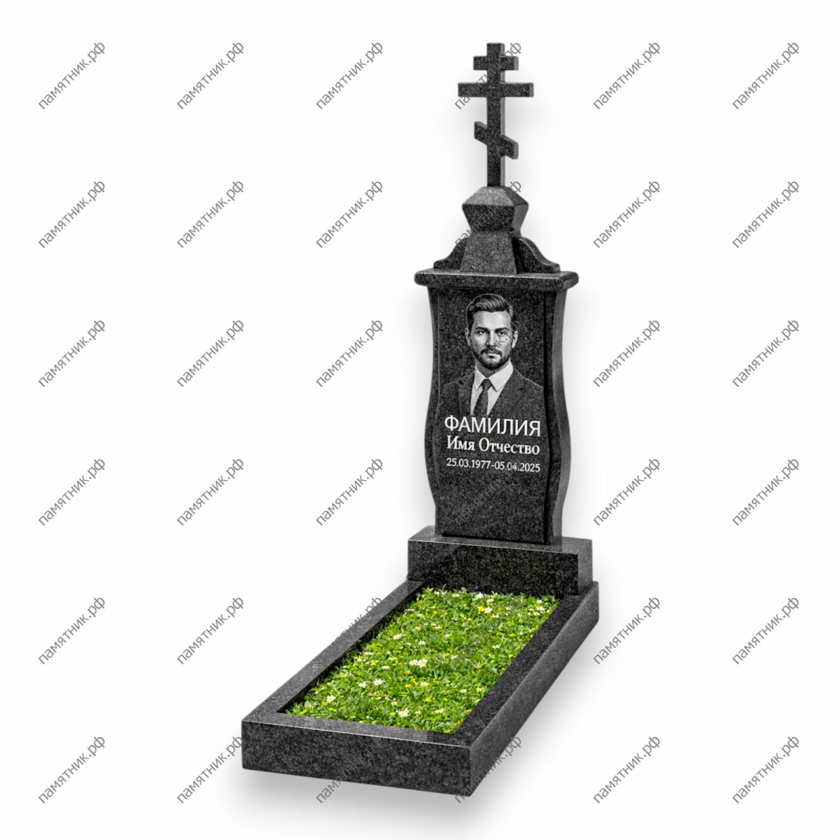 Модель с элегантными волнообразными боковыми гранями, которые смягчают строгость камня. Завершает композицию фигурный многоуровневый постамент, увенчанный крестом. Плавные линии стелы символизируют течение времени и вечность души.