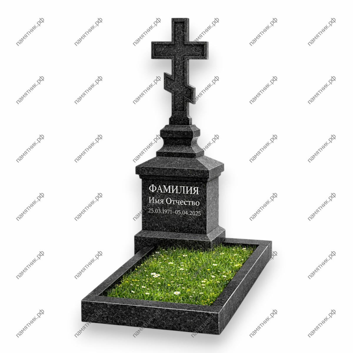 Максимально строгая, мужская и монументальная Голгофа. Широкий прямоугольный постамент (стела) переходит в массивное многоуровневое основание, на котором установлен толстый, основательный восьмиконечный крест с прямыми рублеными гранями. Дизайн лишен округлостей и плавных линий, символизируя незыблемость, силу и вечную память.