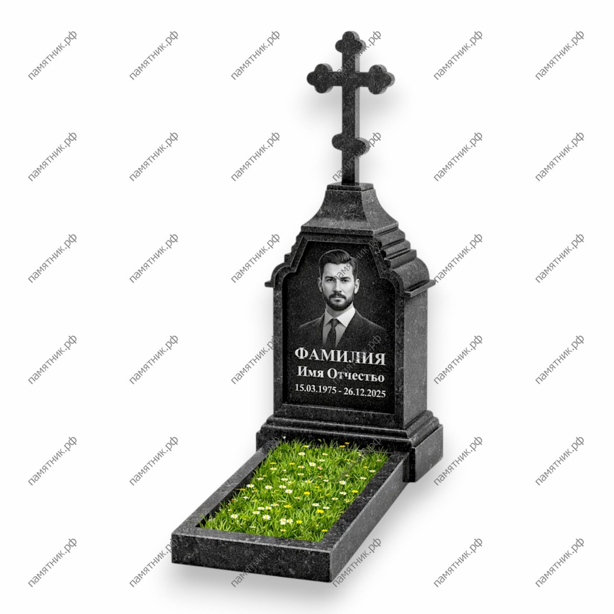 Оригинальная модель с архитектурным навершием, напоминающим ярусный свод храма. Прямые боковые грани стелы подчеркивают строгость, а сложный ступенчатый переход к кресту добавляет форме динамики и величия. Баланс между классикой и нестандартными резными решениями.