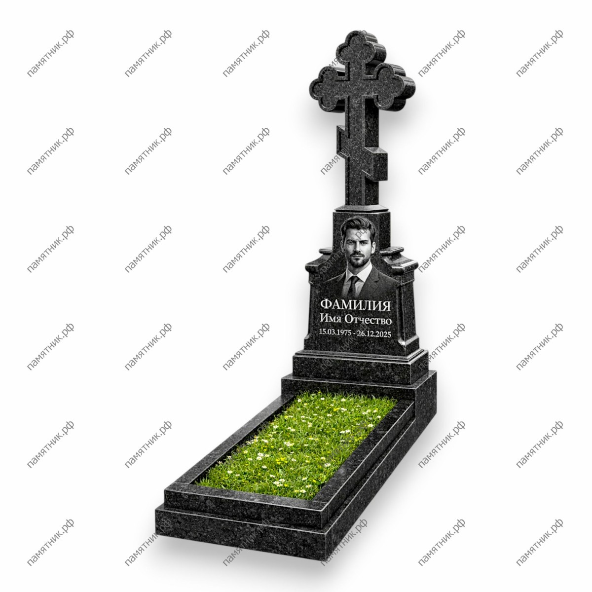 Торжественная модель с классическим архитектурным карнизом-постаментом, который возвышается над зоной портрета. На карнизе установлен красивый, массивно вырезанный крест-трилистник. Строгие прямоугольные формы самой стелы уравновешиваются фигурной резкой креста, создавая солидный и глубоко традиционный мемориал.