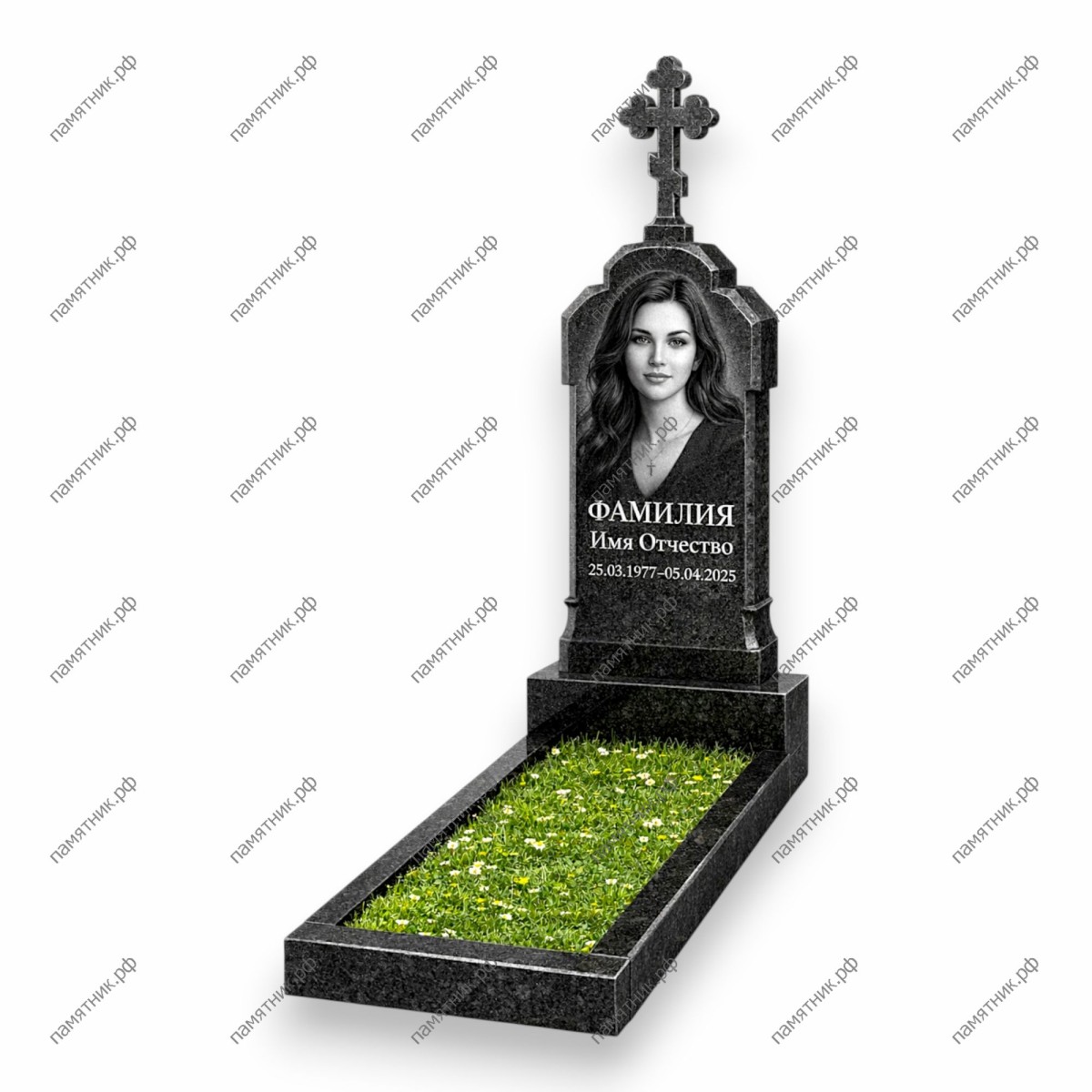 Оригинальная модель со сложным архитектурным контуром. Верхняя часть стелы вырезана в форме ступенчатого храмового свода: центральная арка обрамлена боковыми ярусами. На вершине установлен детализированный крест-трилистник. Дизайн отличается богатством рельефа и глубоким христианским символизмом.
