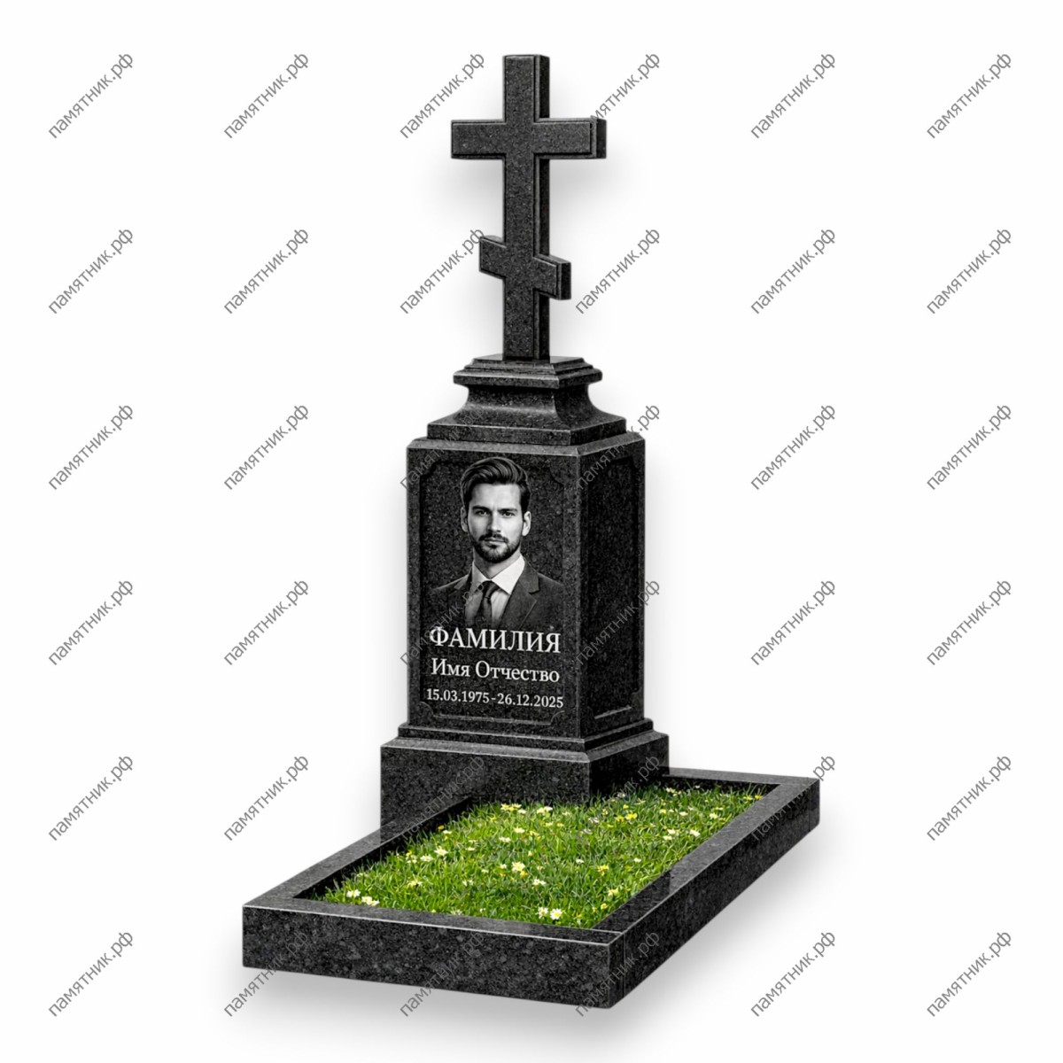 Прямоугольная классика с акцентом на архитектурный постамент. Сама стела имеет строгие ровные грани, предоставляя большое пространство для крупного портрета и эпитафии. Над ней расположен глубоко прорезанный, многоступенчатый карниз, служащий основанием для прямого, лаконичного православного креста.