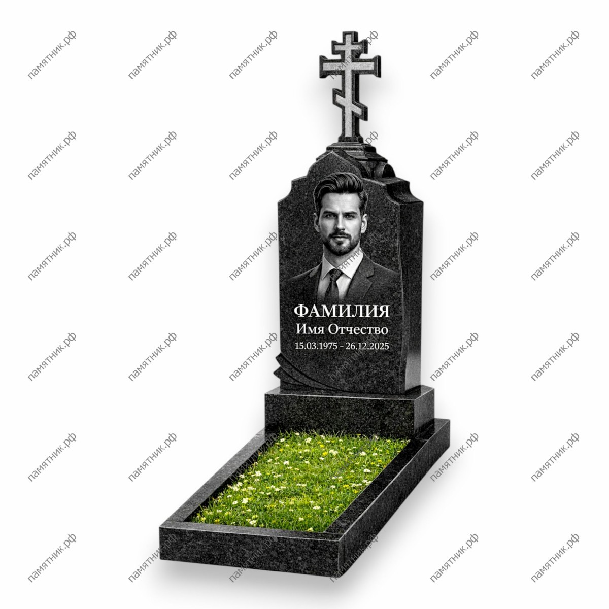 Оригинальная модель с художественной резкой у основания. Верхняя часть стелы имеет классический арочный свод и увенчана изящным крестом-трилистником. Главная особенность дизайна — диагональные резные линии (каннелюры) в нижней части стелы, напоминающие сложенную драпировку или скошенный свиток. Этот декоративный элемент придает памятнику легкость и динамику.