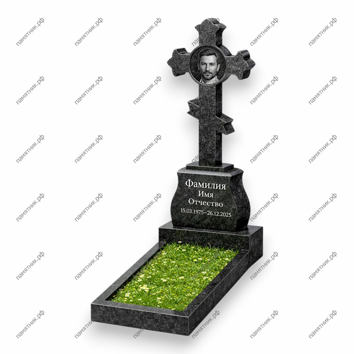 Эксклюзивная и высокохудожественная модель. В отличие от классических Голгоф, портрет усопшего размещен непосредственно в центре крупного креста-трилистника (в круглом медальоне). Основанием служит широкая, приземистая стела с плавными боковыми изгибами, предназначенная исключительно для эпитафии и ФИО. Дизайн выглядит очень торжественно, нестандартно и глубоко символично.