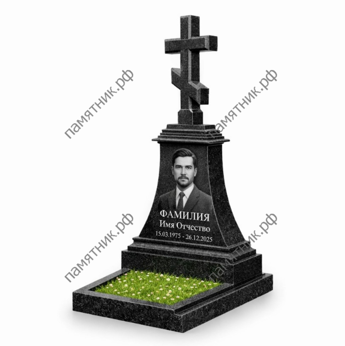 Элегантная модель с выразительным вогнутым контуром (форма «приталенной» стелы). Боковые грани плавно расширяются книзу, придавая памятнику устойчивость и визуальную легкость одновременно. Вершина стелы украшена сложным многоступенчатым карнизом, на котором возвышается строгий восьмиконечный крест.