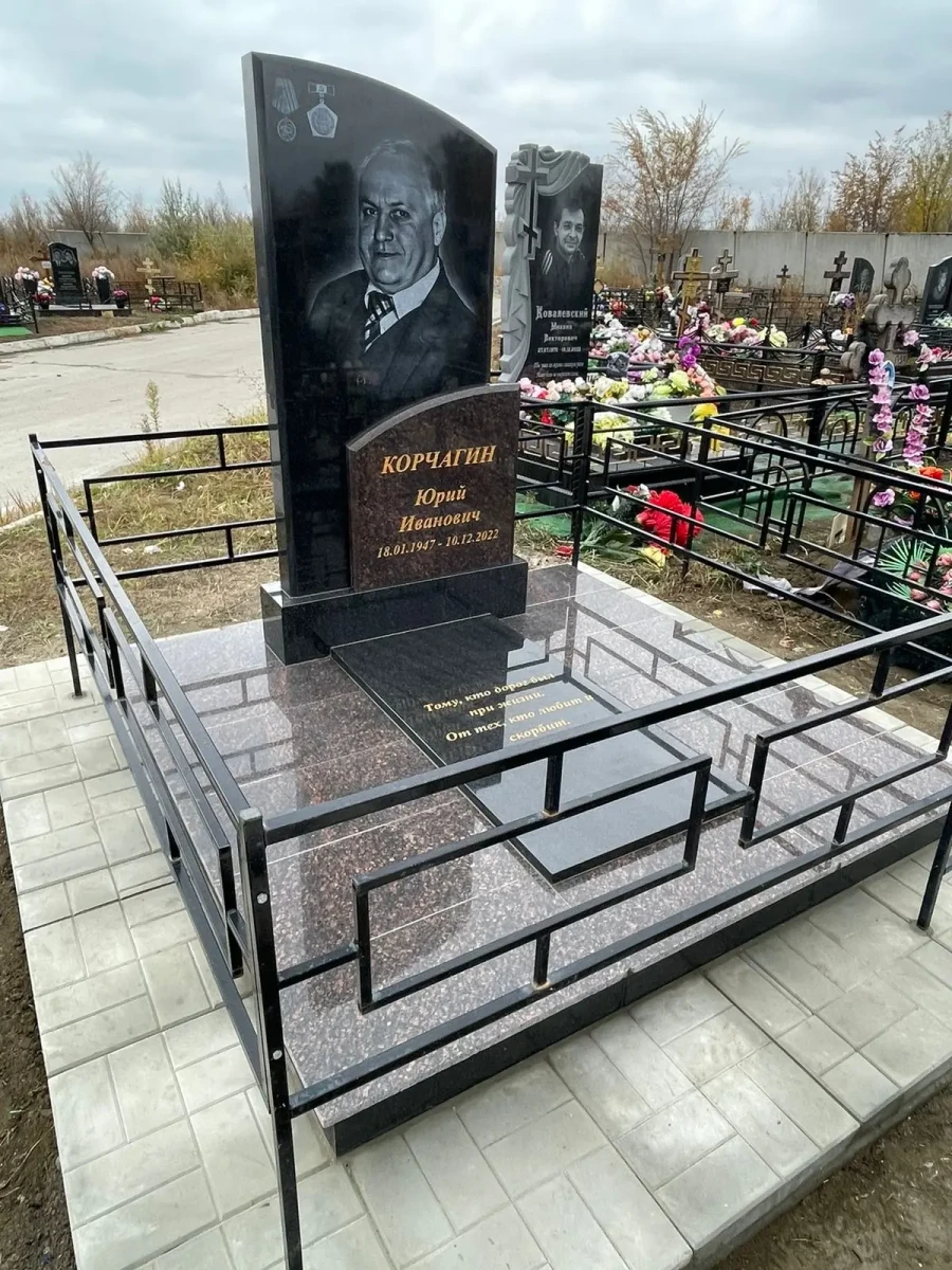 - Надгробная зона оформлена в виде двухступенчатого подиума. На широком основании из коричневого гранита установлена черная зеркальная плита с эпитафией.