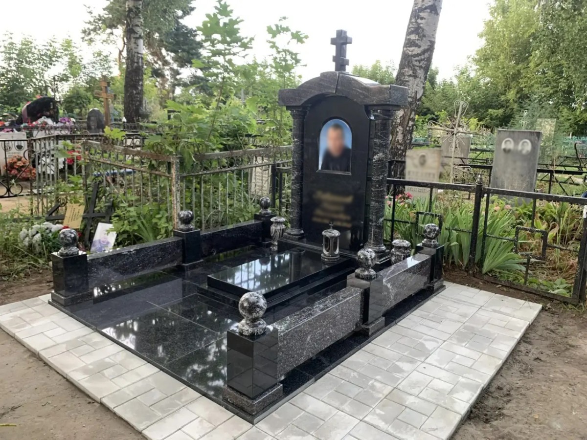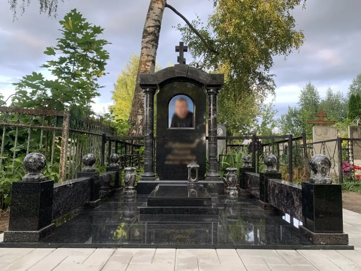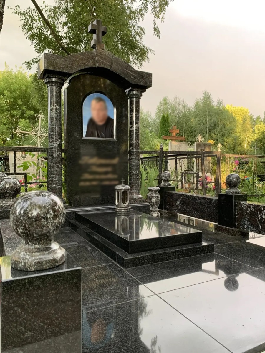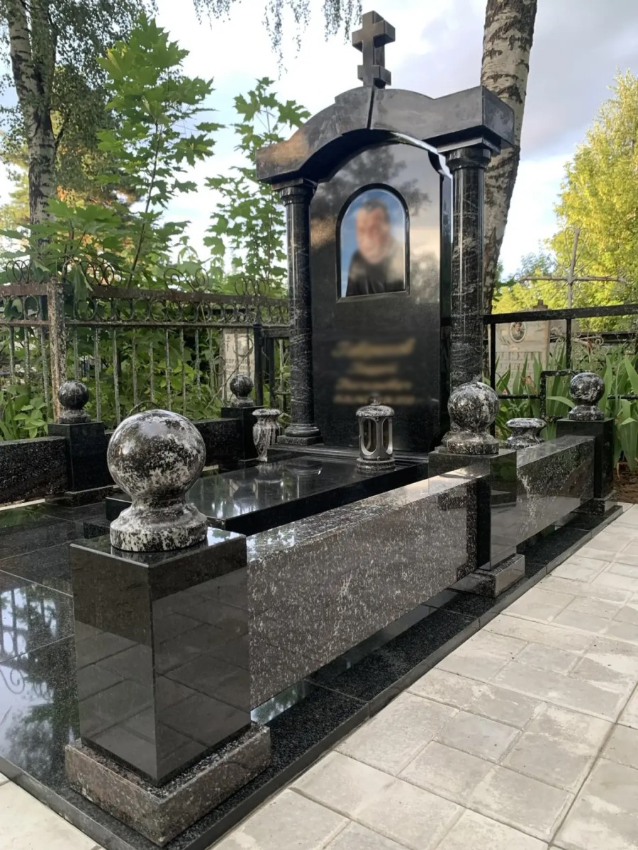 Величественный и монументальный мемориальный комплекс, выполненный в виде православной часовни. Этот эксклюзивный проект воплощает в себе глубокое уважение и светлую память, представляя собой настоящее произведение мемориальной архитектуры. Комплекс создан из комбинации высококачественных гранитов: глубокого черного камня (габбро-диабаз) для основы и стелы, а также фактурного темно-серого гранита с природным рисунком для декоративных элементов.