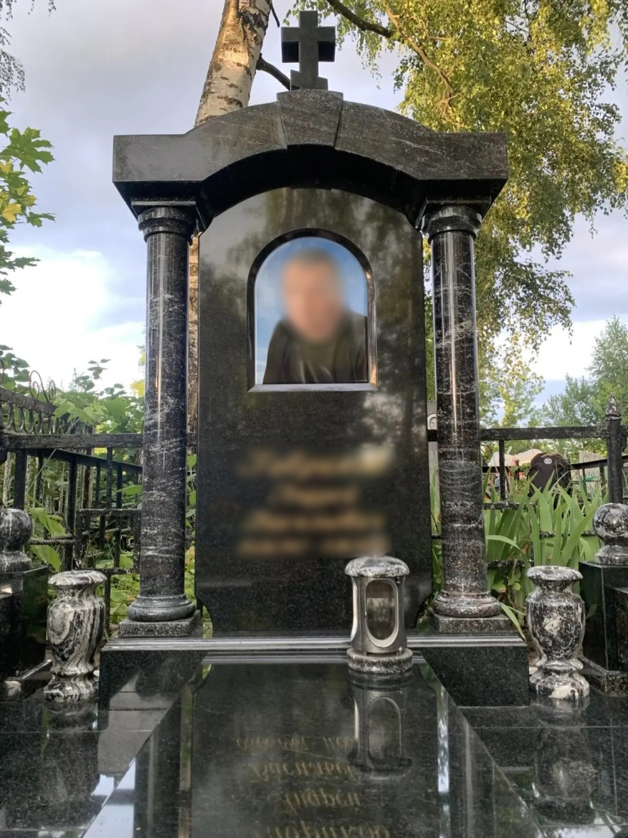 - Оформление портрета: В центре основной стелы вырезана глубокая арочная ниша, в которую интегрирован крупный цветной портрет. Использование технологии «портрет на стекле» (или крупной фотокерамики) обеспечивает невероятную реалистичность, яркость красок и защиту изображения от выцветания на десятилетия.