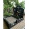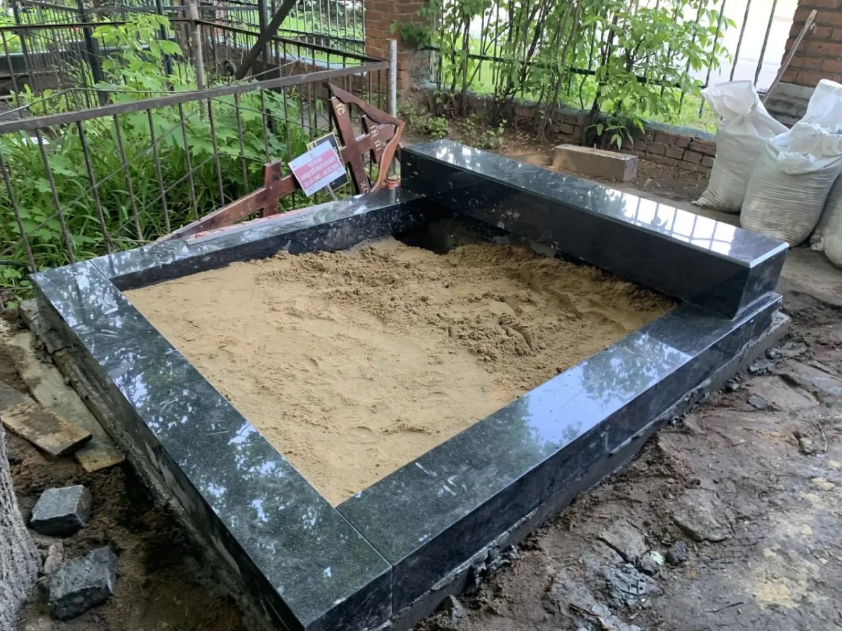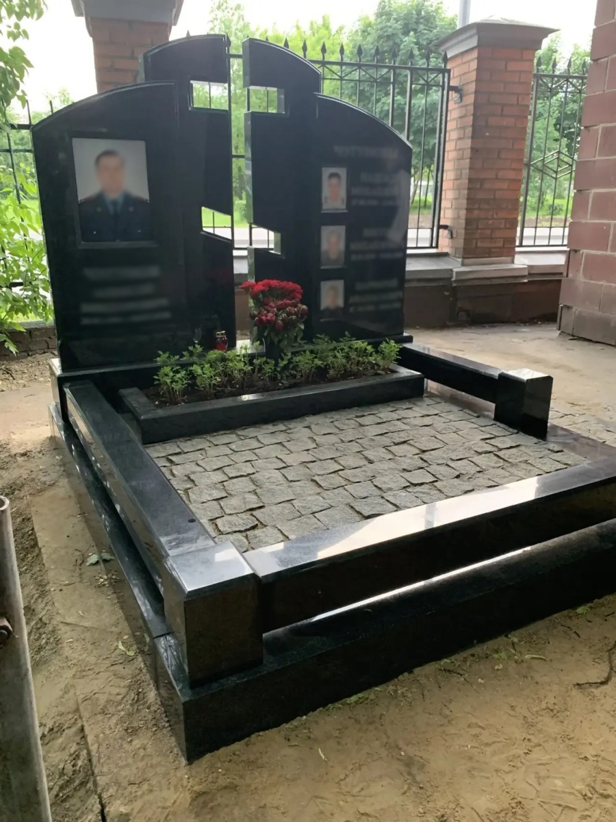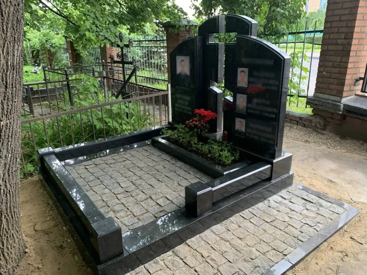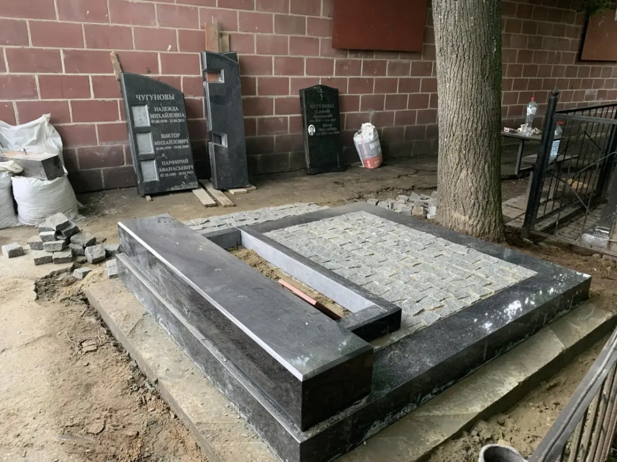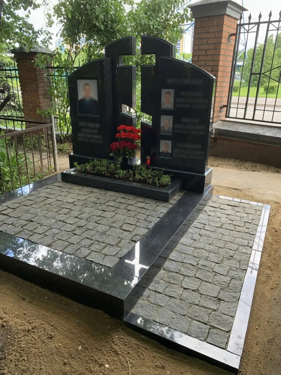 - Благоустройство участка: Комбинированное мощение. Основная площадь участка выложена колотой серой брусчаткой, что обеспечивает отличный дренаж, препятствует росту сорняков и придает захоронению аккуратный, ухоженный вид. По периметру участок обрамлен массивным полированным цоколем из черного гранита, который гармонирует с материалом памятника.