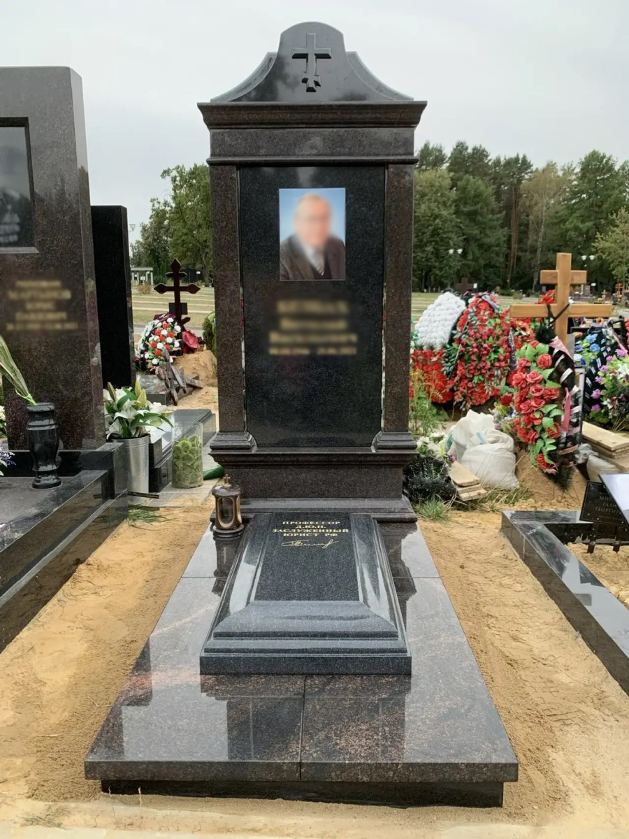 - Художественное оформление: * В верхней части центральной черной стелы расположена глубокая ниша для крупного цветного портрета (выполненного по технологии фотокерамики или печати на стекле).