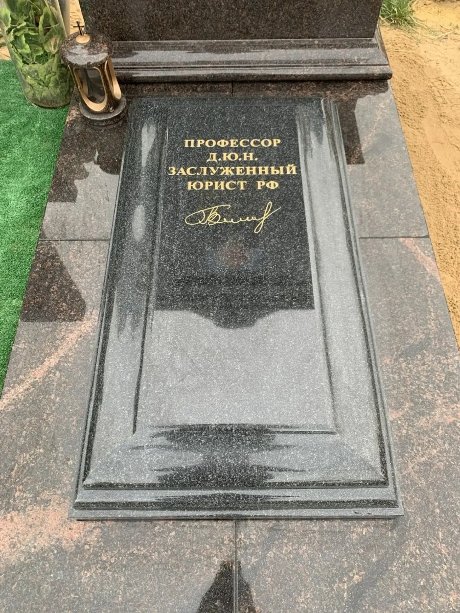 - На поверхности плиты золотом выгравированы профессиональные звания, регалии усопшего и точная копия его личной подписи, что делает мемориал абсолютно уникальным.