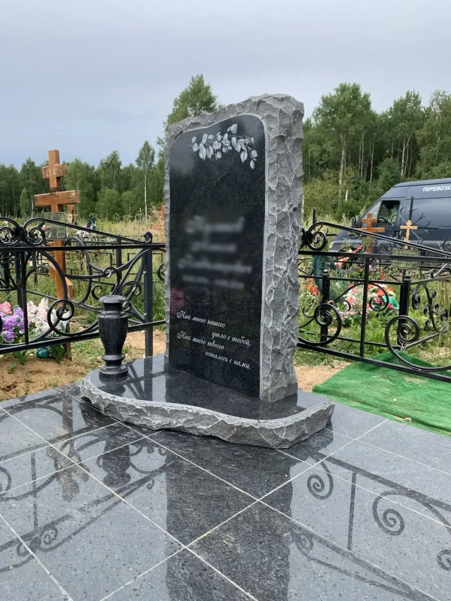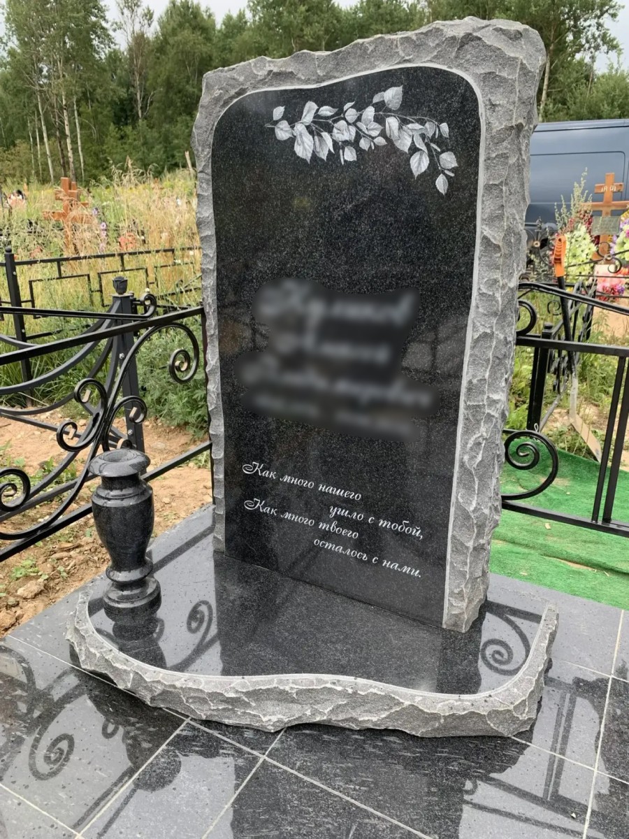 Выразительная и символичная модель мемориала, которая гармонично сочетает в себе природную первозданность камня и безупречную зеркальную полировку. Особенность этого памятника — фактура «скала» (также известная как «корка»). Лицевая часть стелы идеально отполирована для нанесения художественной гравировки, тогда как боковые и верхняя грани оставлены в своем естественном, рельефном виде. Такой контраст подчеркивает монументальность, прочность и вечность натурального черного гранита (габбро-диабаза).