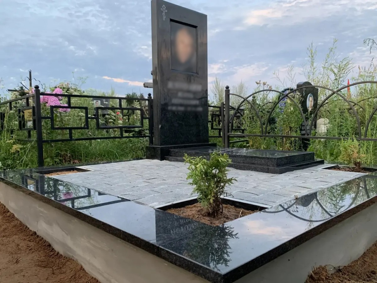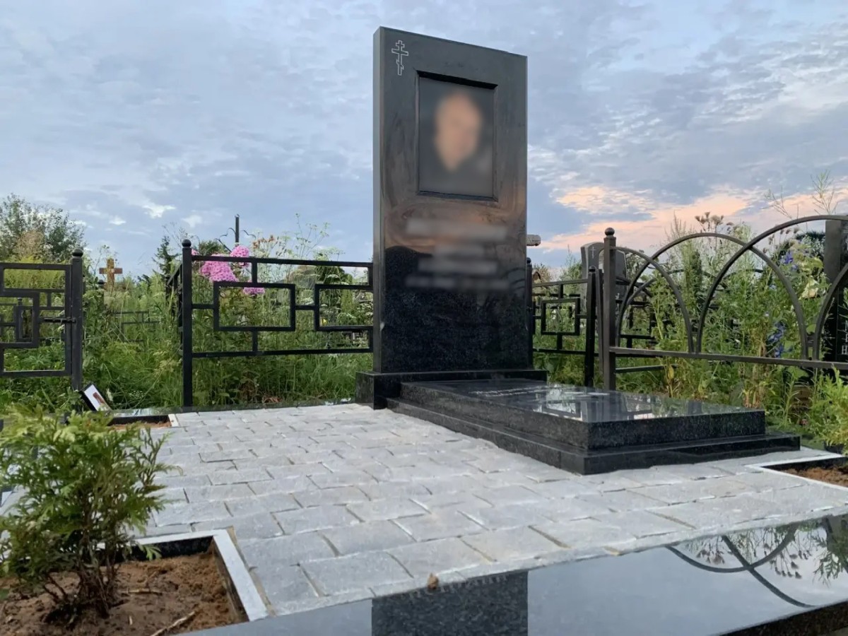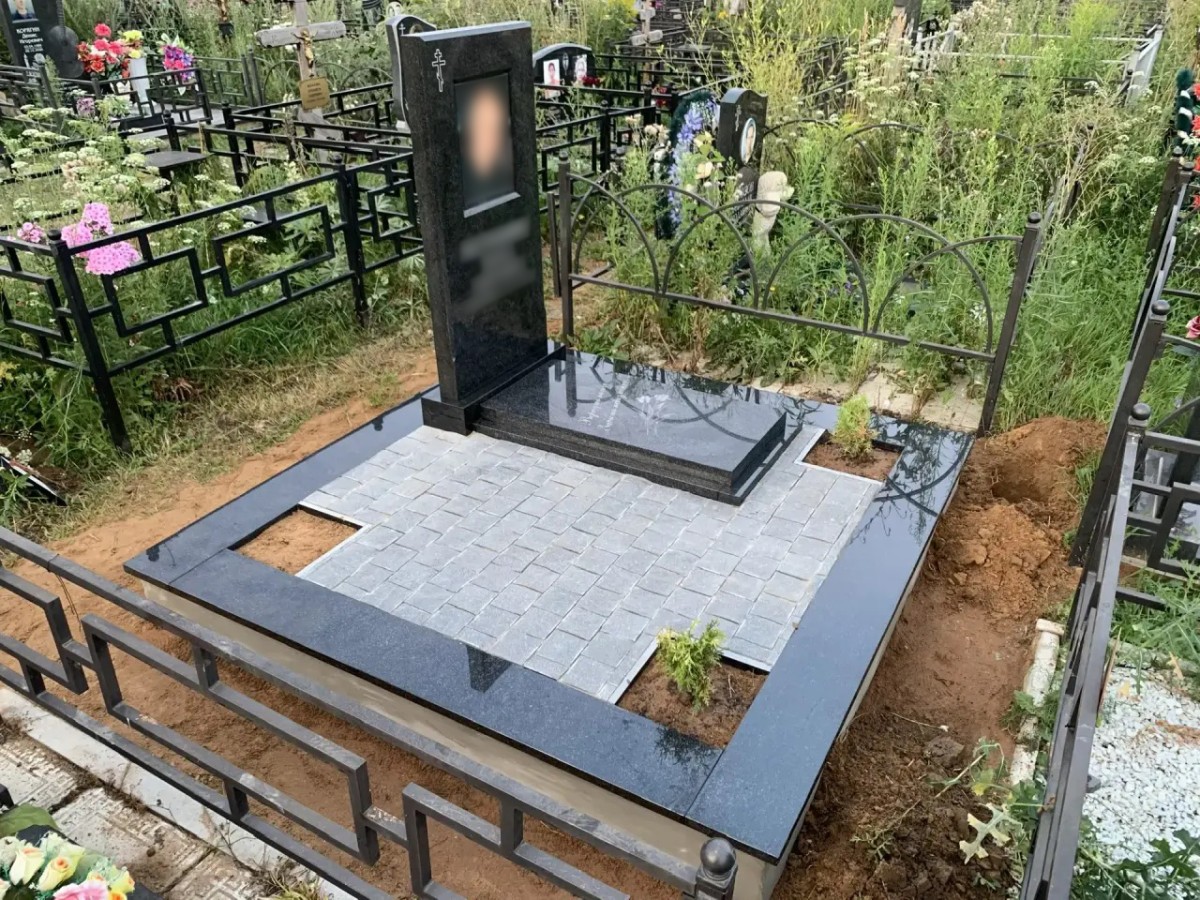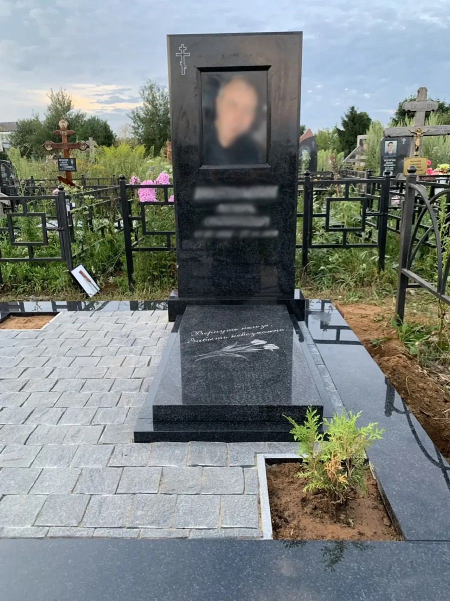 • Гранитный цоколь и основание: Участок обрамлен плоским гранитным бордюром, который служит четкой границей мемориала. Весь комплекс установлен на капитальный бетонный подиум, гарантирующий отсутствие просадок.