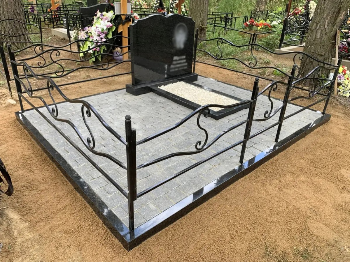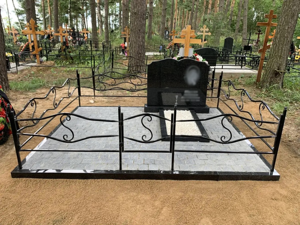 - Гранитный цоколь и основание: Участок обрамлен плоским гранитным бордюром, который служит четкой границей мемориала. Весь комплекс установлен на капитальный бетонный подиум, гарантирующий отсутствие просадок.