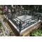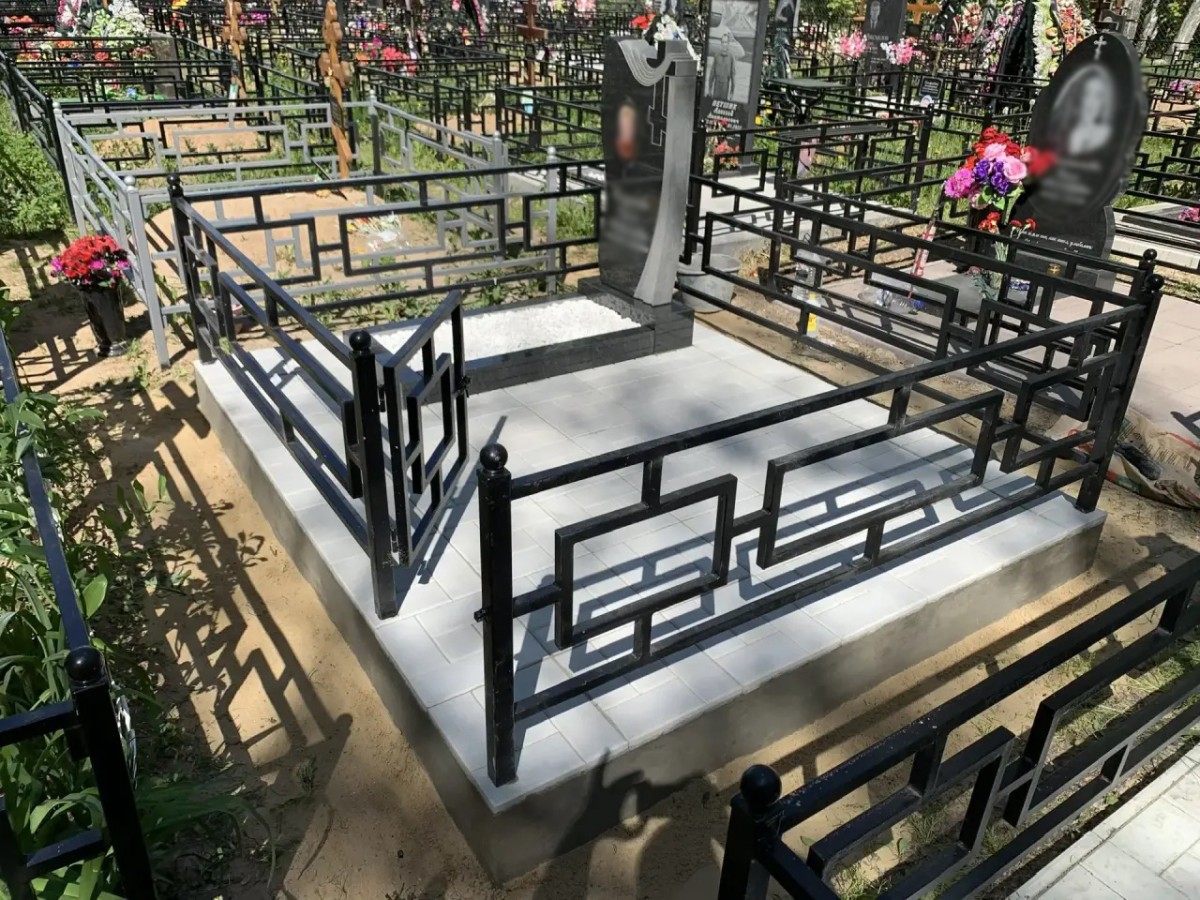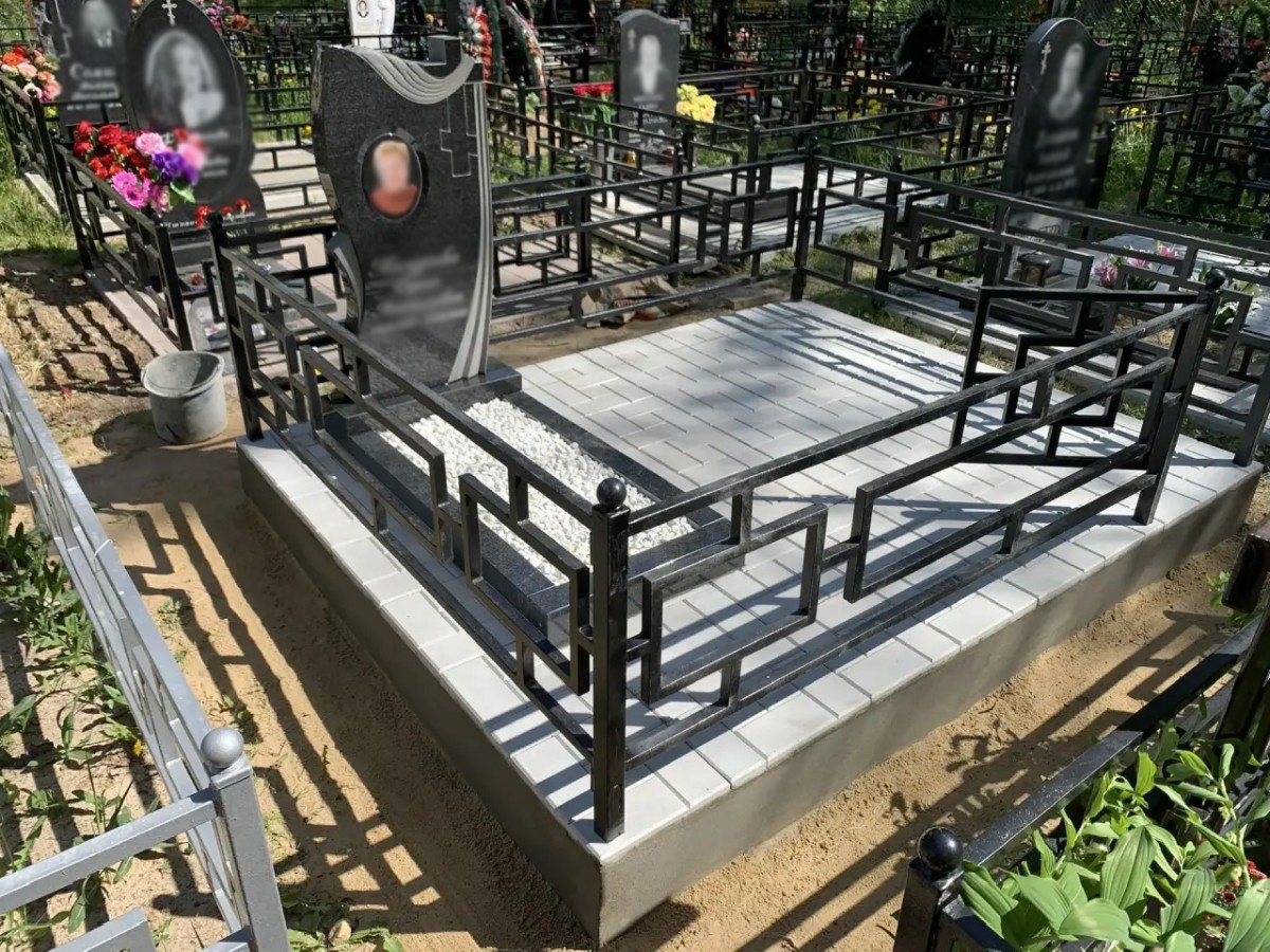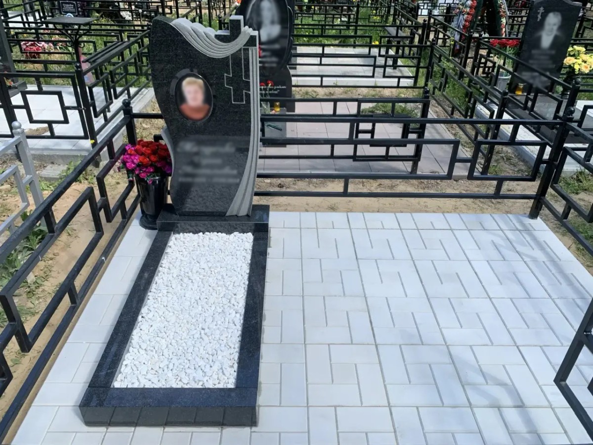 - Геометрическая ограда: Участок обрамлен современной металлической сварной оградой черного цвета. Узор «лабиринт» из строгих прямоугольных линий идеально перекликается с формой плитки и подчеркивает современный стиль мемориала.