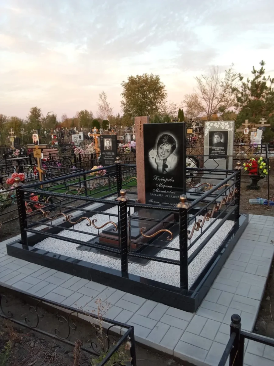 - Деталь: Ограда выполнена в стиле «черное золото» — строгие черные столбы с шарообразными навершиями дополнены изящными завитками бронзового оттенка. Это перекликается с крестом на стеле и создает единую визуальную нить.