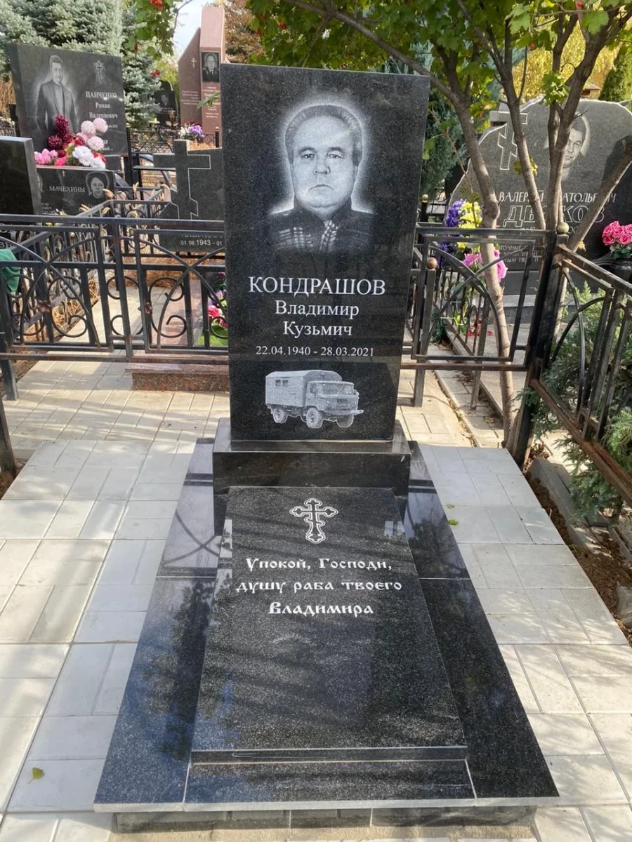 - Художественная графика: Портрет выполнен в технике мягкой растушевки, создающей эффект объема. Особую ценность представляет нижняя часть стелы, где размещена высокоточная гравировка автомобиля (ГАЗ-66), символизирующая профессиональную деятельность или жизненное увлечение.