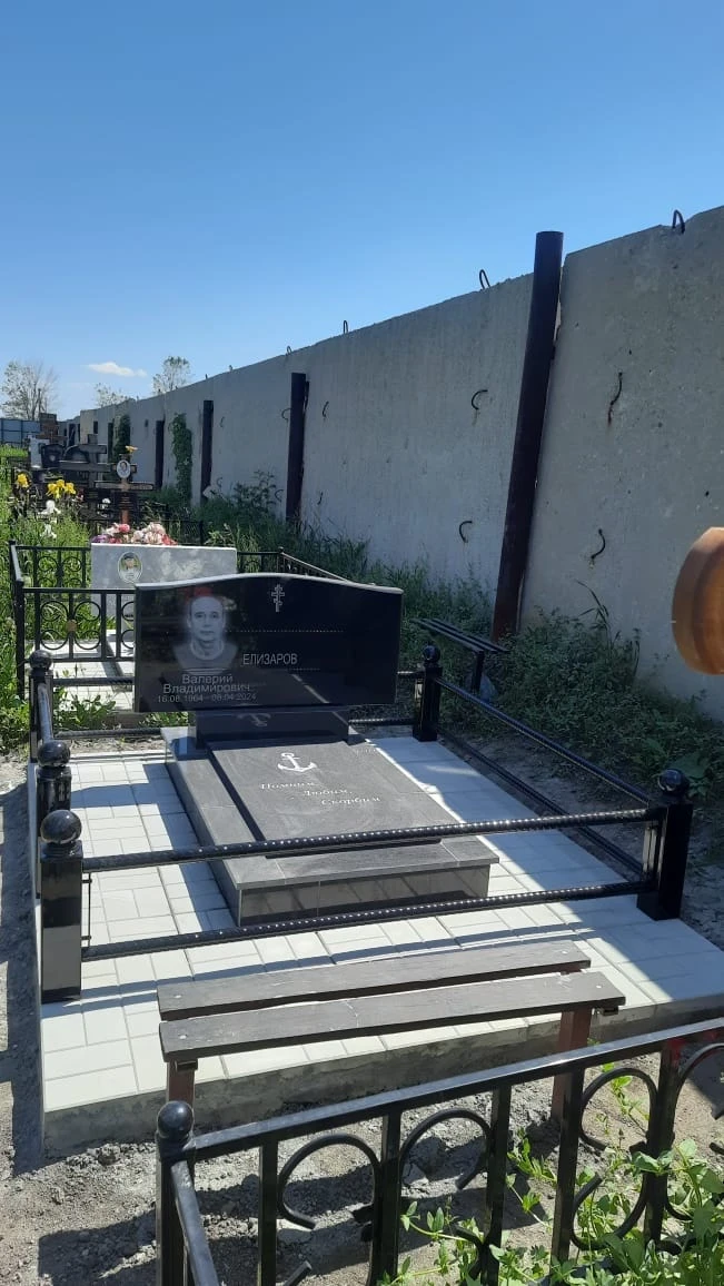 - Участок вымощен светло-серой квадратной плиткой. Это решение 2025 года служит «световым паспарту», на фоне которого черный гранит выглядит максимально четко и торжественно. Плитка обеспечивает идеальный дренаж и чистоту участка.