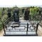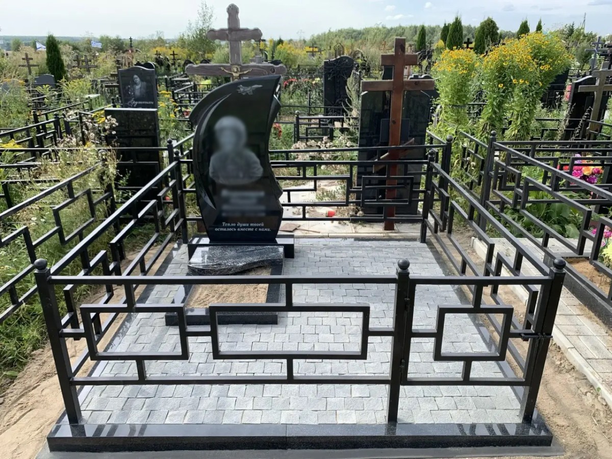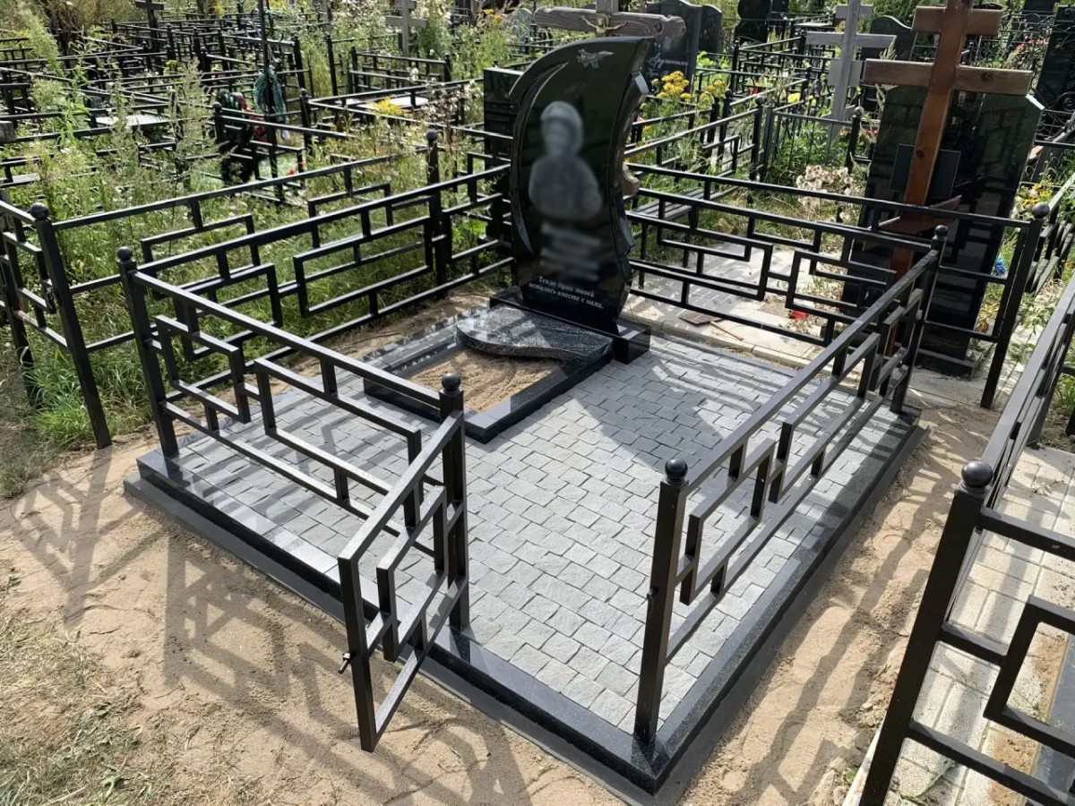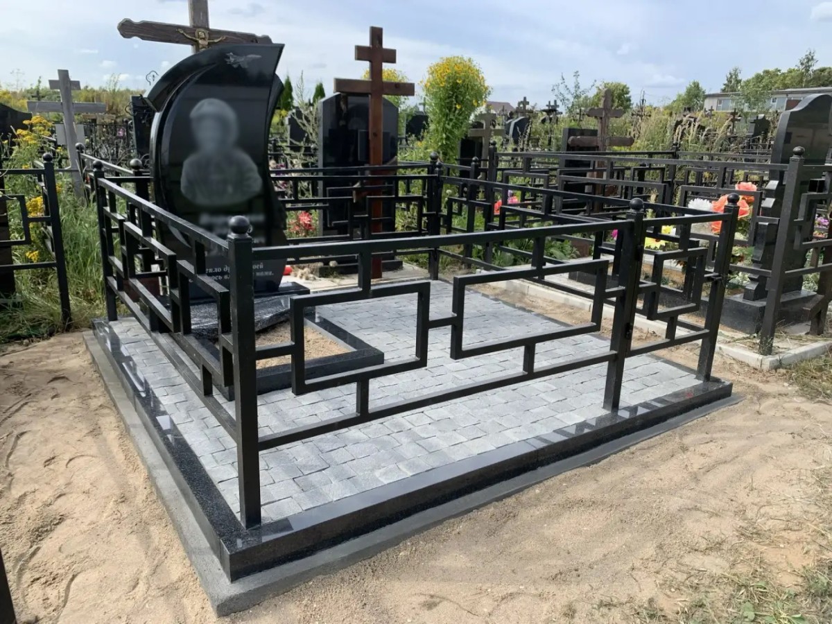 - Ограда: Установлена стильная металлическая сварная ограда с ярко выраженным геометрическим (прямоугольным) орнаментом. Черное антикоррозийное покрытие ограды и декоративные шары на опорных столбиках отлично перекликаются с материалом памятника.