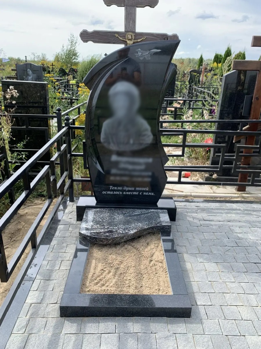 - В верхней части выгравированы православный крест и символический рисунок самолета (отражающий профессию или главное увлечение усопшего).