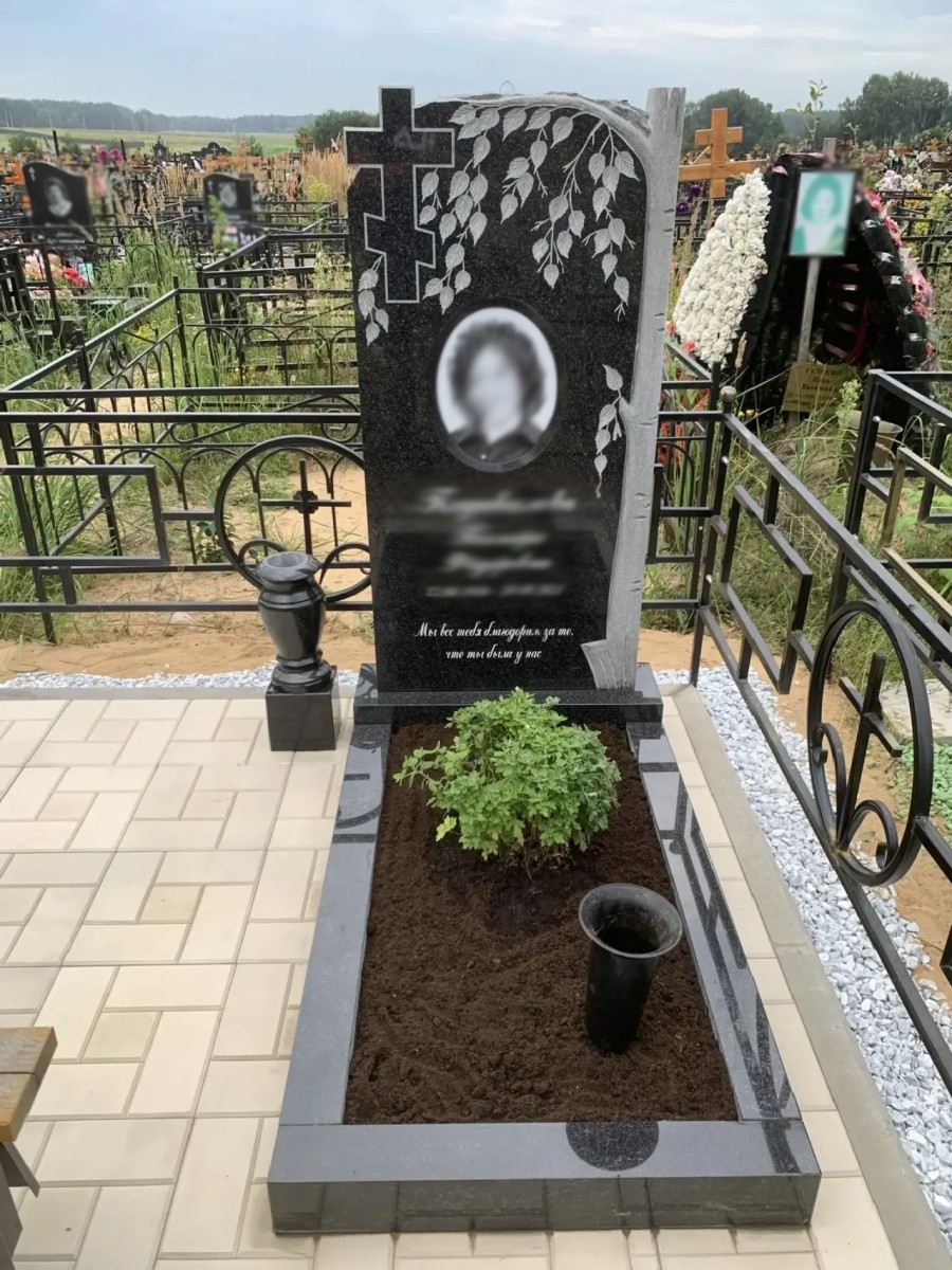 Изящный и глубоко символичный мемориал, в дизайне которого переплетаются православные традиции и нежная эстетика родной природы. Памятник выполнен из премиального карельского черного гранита (габбро-диабаза), чья зеркальная поверхность служит идеальным фоном для сложной художественной резьбы.