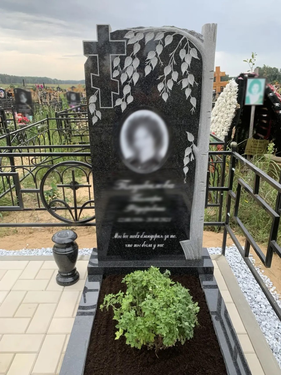 - Тонкая гравировка березовых листьев обрамляет верхнюю часть памятника, создавая естественную «раму» для портрета.