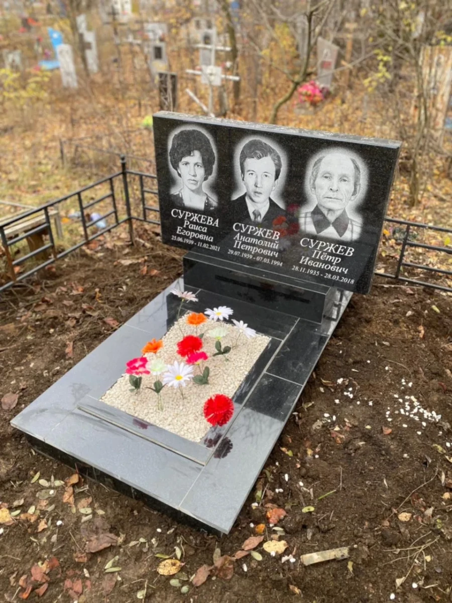 - Массивная прямоугольная плита с идеальной зеркальной полировкой. Горизонтальная ориентация выбрана для оптимального размещения трех портретов в один ряд, что создает визуальное ощущение семейного единства.