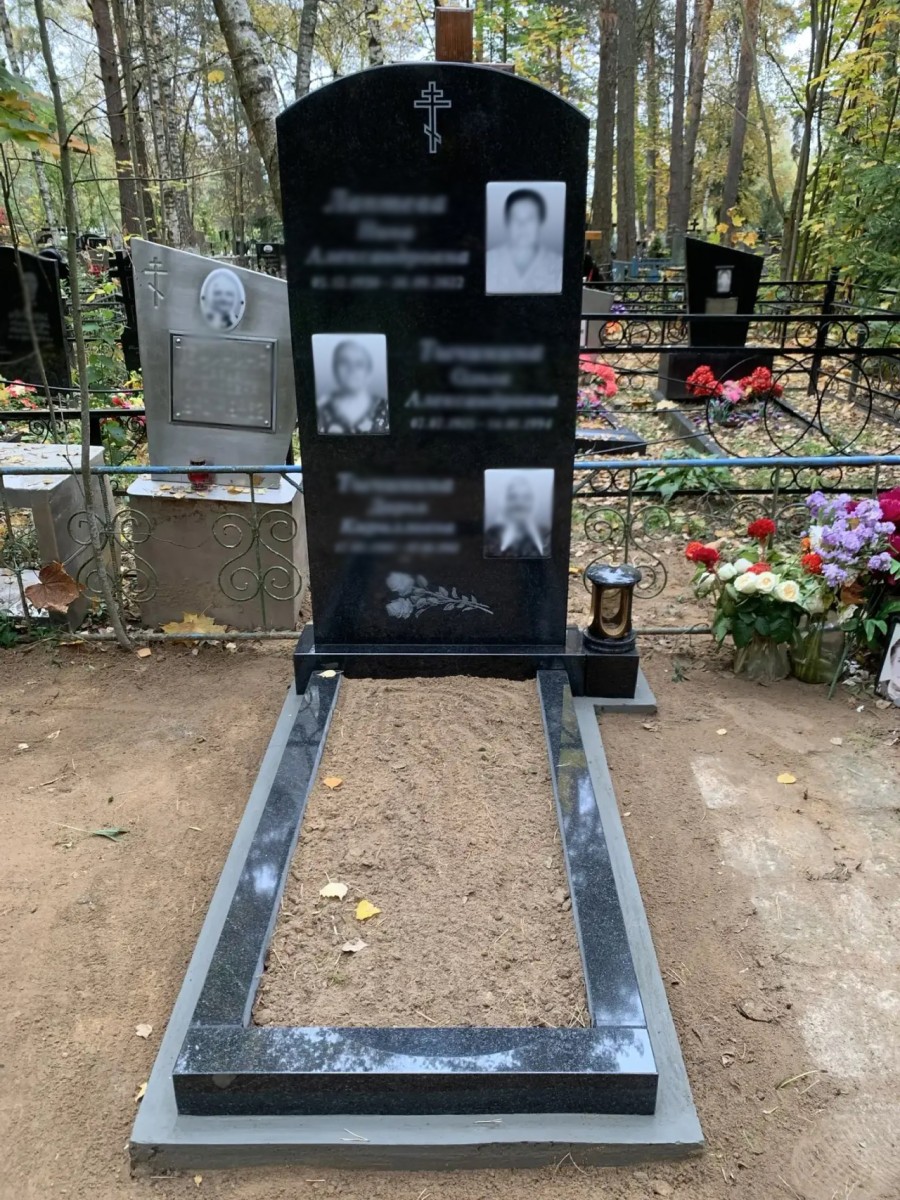 Вертикальный формат стелы в сочетании с арочным завершением позволяет гармонично расположить информацию о трех усопших, сохраняя визуальную легкость и торжественность композиции.