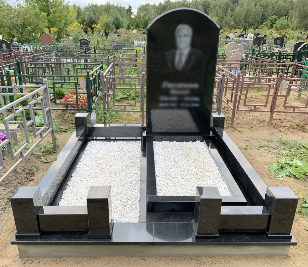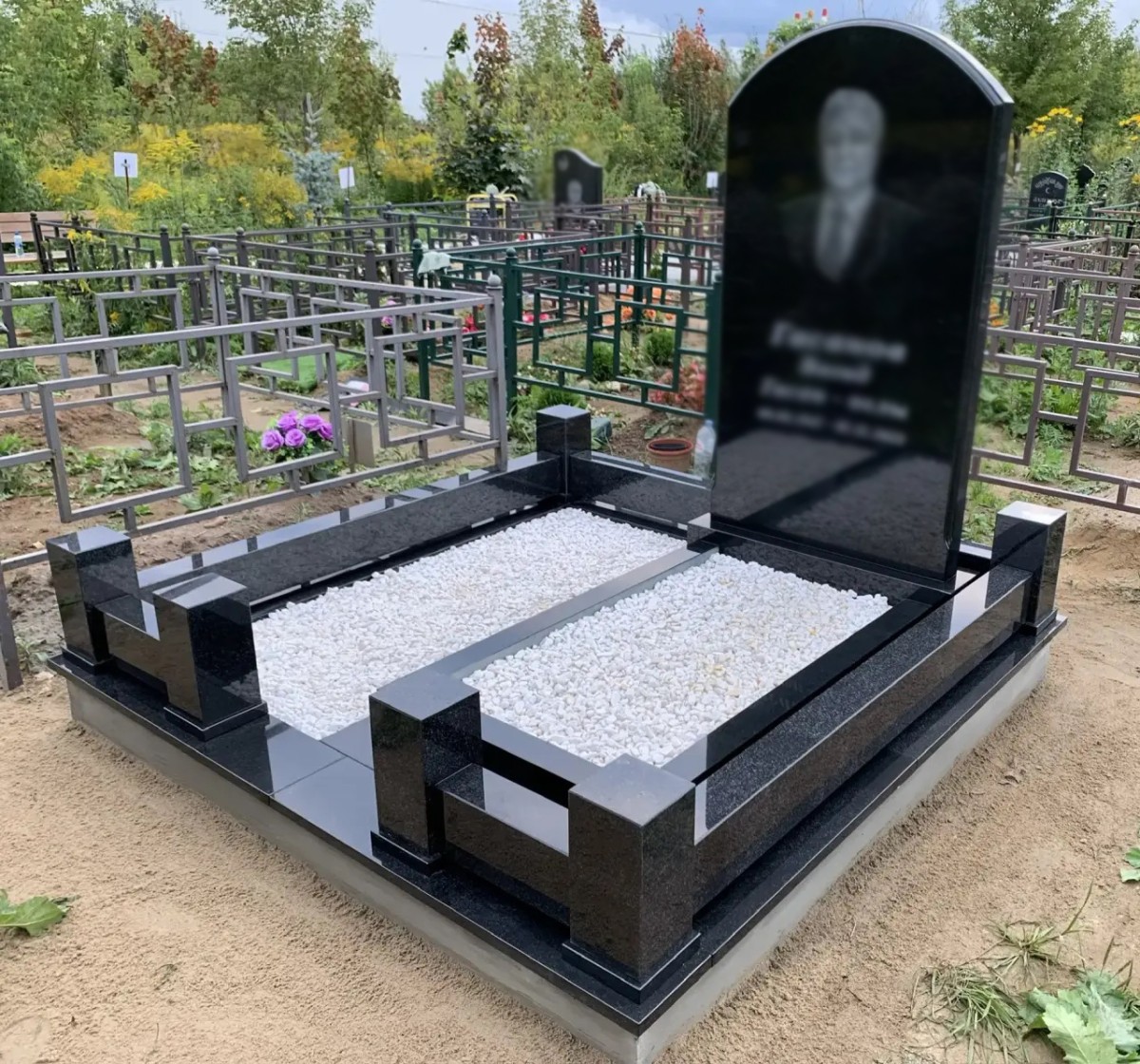 - Участок обрамлен низким гранитным поребриком из черного полированного камня.
