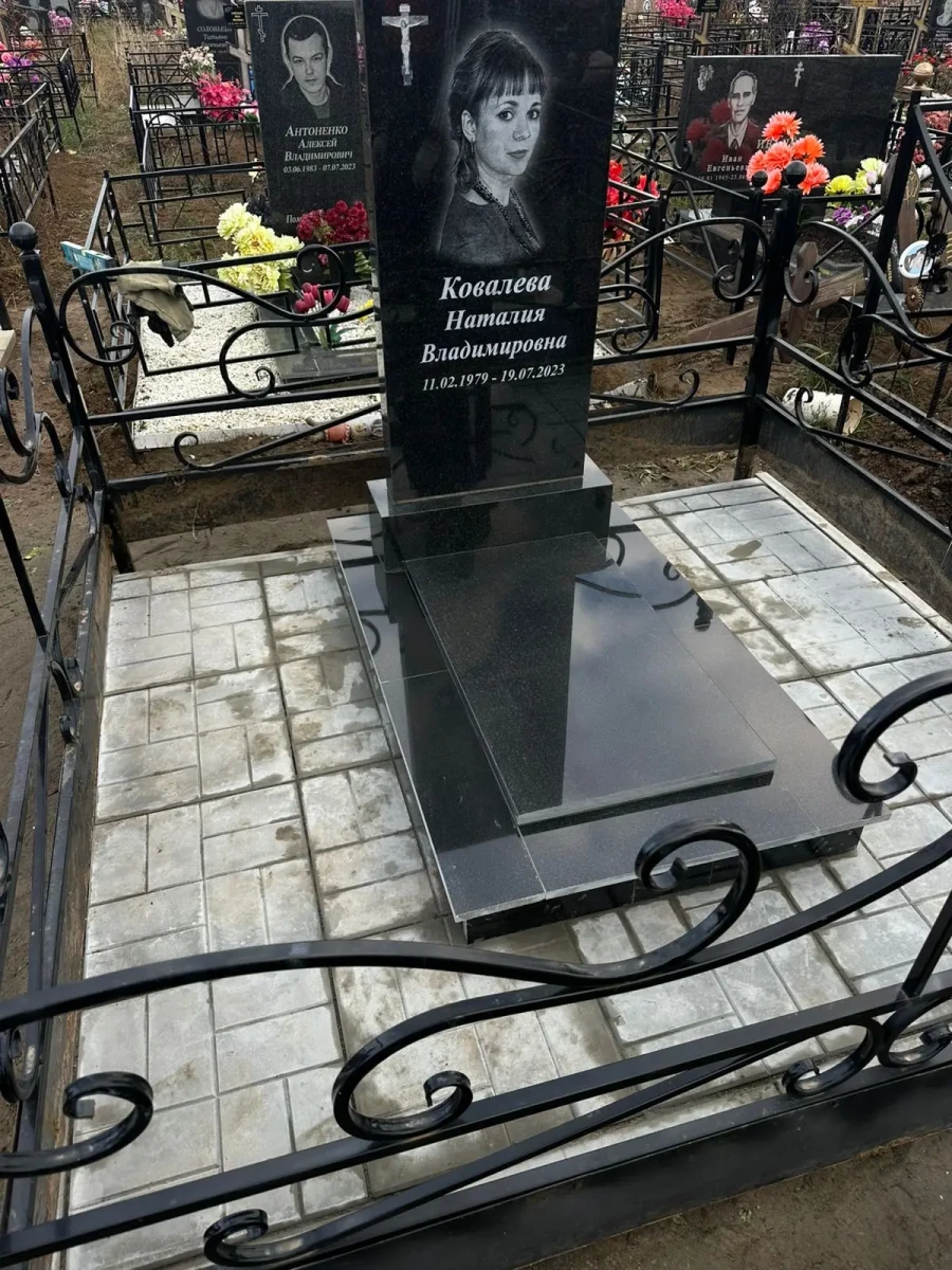 - Участок вымощен светло-серой прямоугольной плиткой с четким ритмом швов. Светлый тон основания служит идеальным фоном (паспарту) для черного гранитного ансамбля.