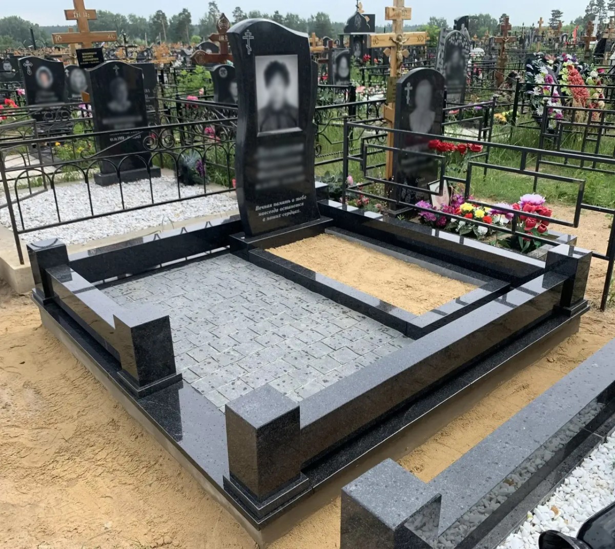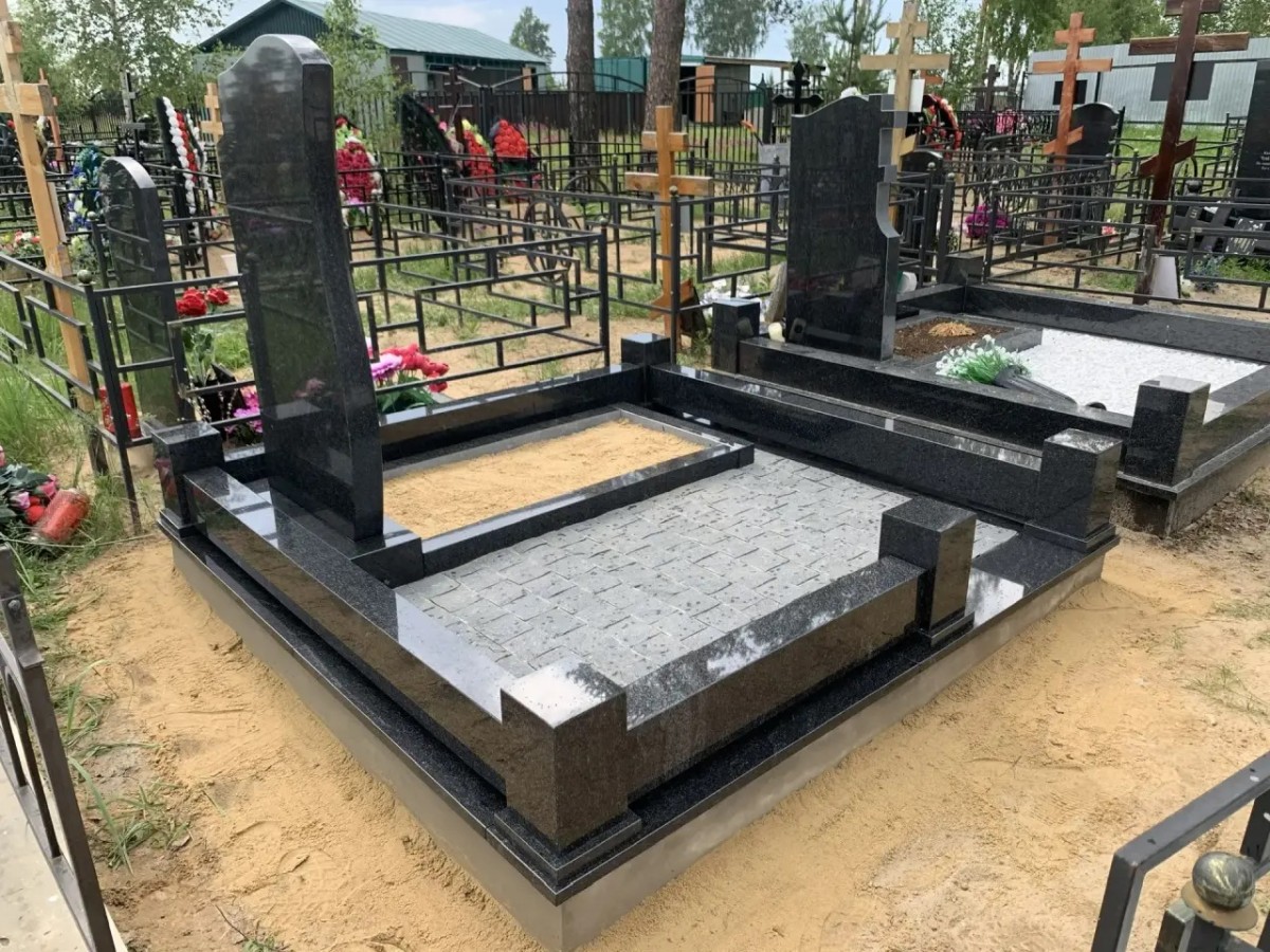 Комплекс представляет собой готовую архитектурную форму, где участок четко разделен на функциональные зоны, что придает захоронению аккуратный и завершенный вид при минимальных требованиях к уходу.