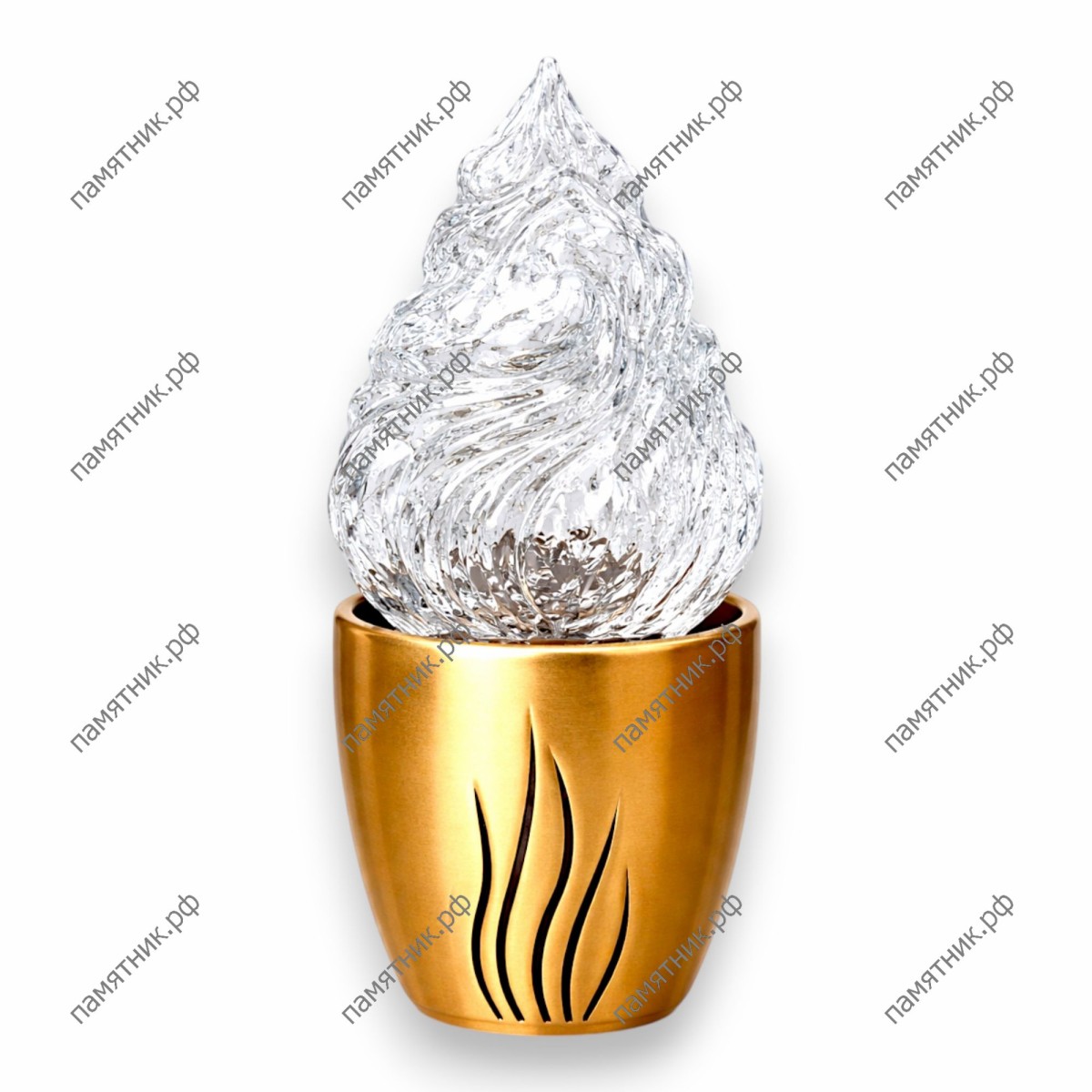 Лаконичная и символичная лампада. Гладкое основание чашеобразной формы украшено сквозными фигурными вырезами, повторяющими контуры огня. Это решение не только облегчает дизайн, но и позволяет свету проникать сквозь металл. Навершие из фактурного стекла напоминает искрящийся лед или живое пламя. В основе изделия лежит подлинная итальянская бронза Caggiati, обеспечивающая абсолютную надежность и долговечность мемориального аксессуара.