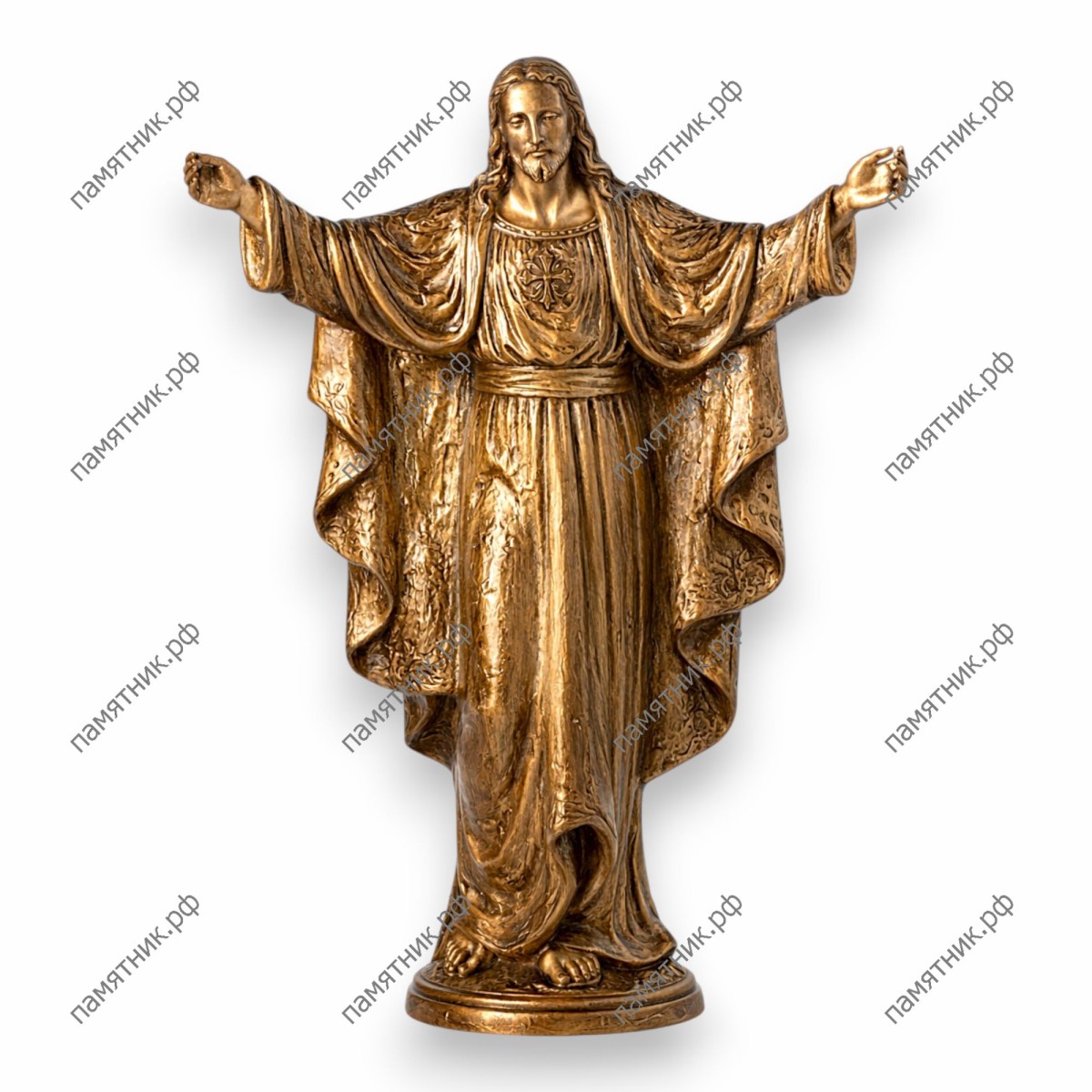 Триумфальный и всеобъемлющий образ Спасителя. Широко раскинутые руки Иисуса Христа символизируют божественное приглашение, прощение и готовность принять каждую душу под свой покров. Мастера итальянской фабрики уделили особое внимание богатой текстуре одеяний, украшенных тонким чеканным орнаментом. Это придает фигуре особую монументальность, делая ее доминантой любого архитектурного ансамбля.