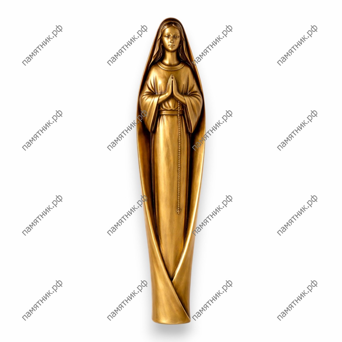 Элегантное и лаконичное прочтение канонического сюжета. Вытянутый, стройный силуэт Девы Марии, окутанный гладким плащом, напоминает мистическую мандорлу — древний символ божественной славы. В руках Богородицы четки (розарий), подчеркивающие непрерывность молитвы за усопших. Идеально ровная фактура премиальной итальянской бронзы прекрасно впишется в мемориальные комплексы современного, минималистичного дизайна.