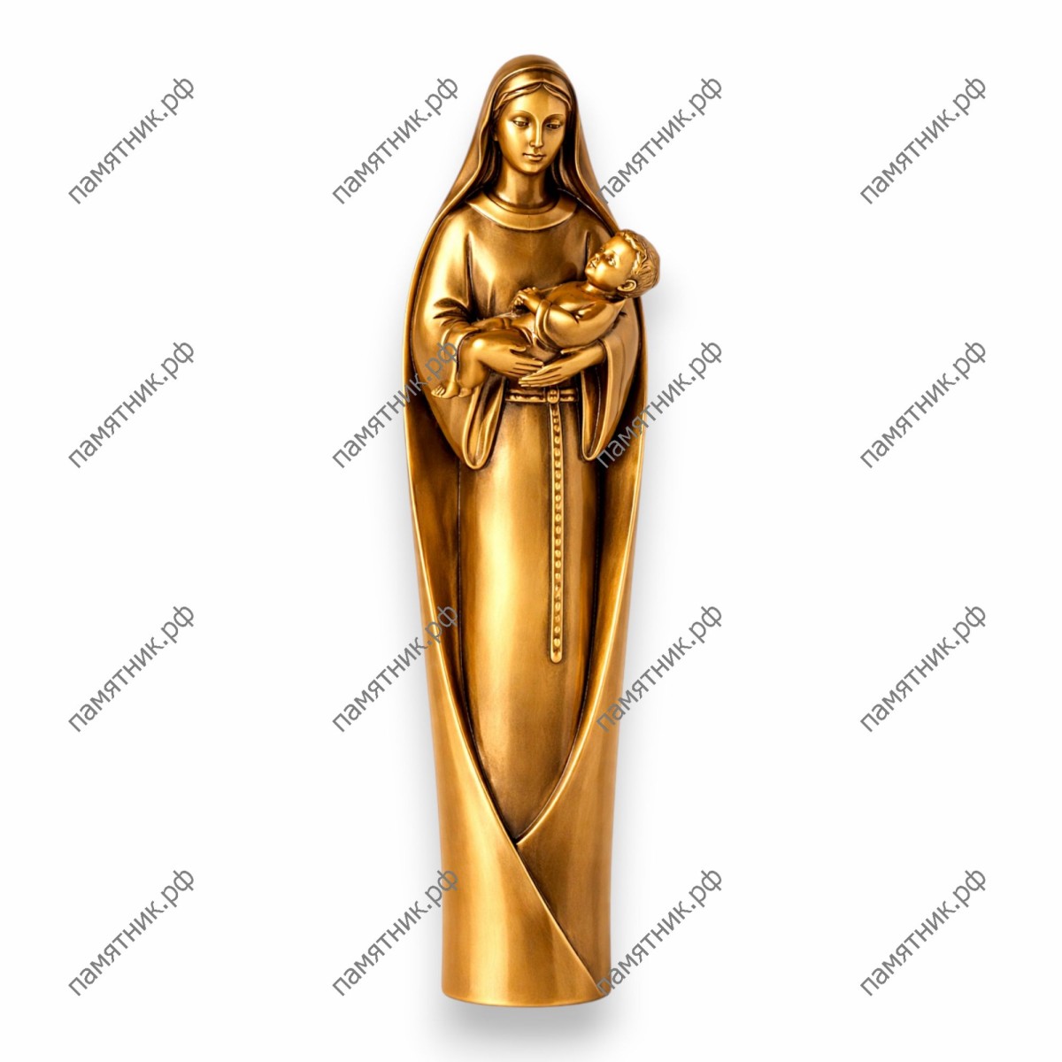 Удивительно гармоничная и минималистичная композиция. Вытянутый, обтекаемый силуэт Богородицы, бережно прижимающей к себе младенца, создает ощущение абсолютного покоя и неразрывной духовной связи. Отсутствие лишних деталей концентрирует внимание на трогательных лицах героев и плавности линий. Элитная бронза, отполированная до мягкого свечения, делает этот современный образ поистине драгоценным элементом архитектурного ансамбля.