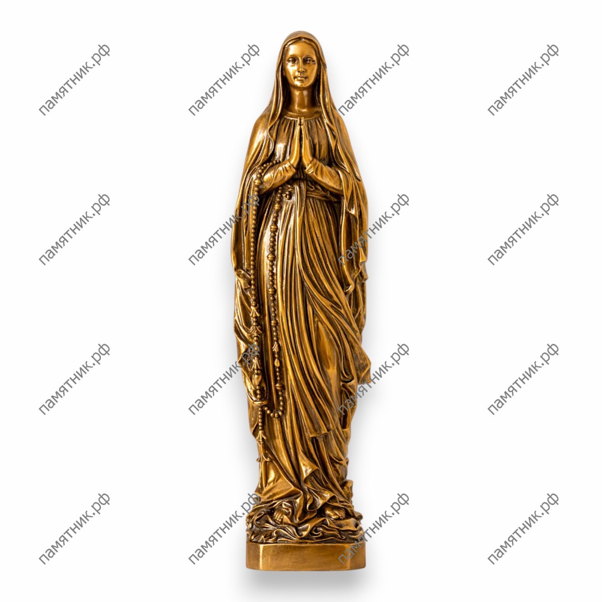 Утонченный и возвышенный образ молящейся Богородицы. Ее руки сложены в молитве, а с них свисает длинный розарий — знак непрестанного заступничества за души. Многослойная драпировка плаща, богатая тонкими струящимися складками, свидетельствует о высочайшем уровне европейского литейного искусства. Эта статуя станет источником утешения и тихой, светлой энергии для всех, кто приходит почтить память.