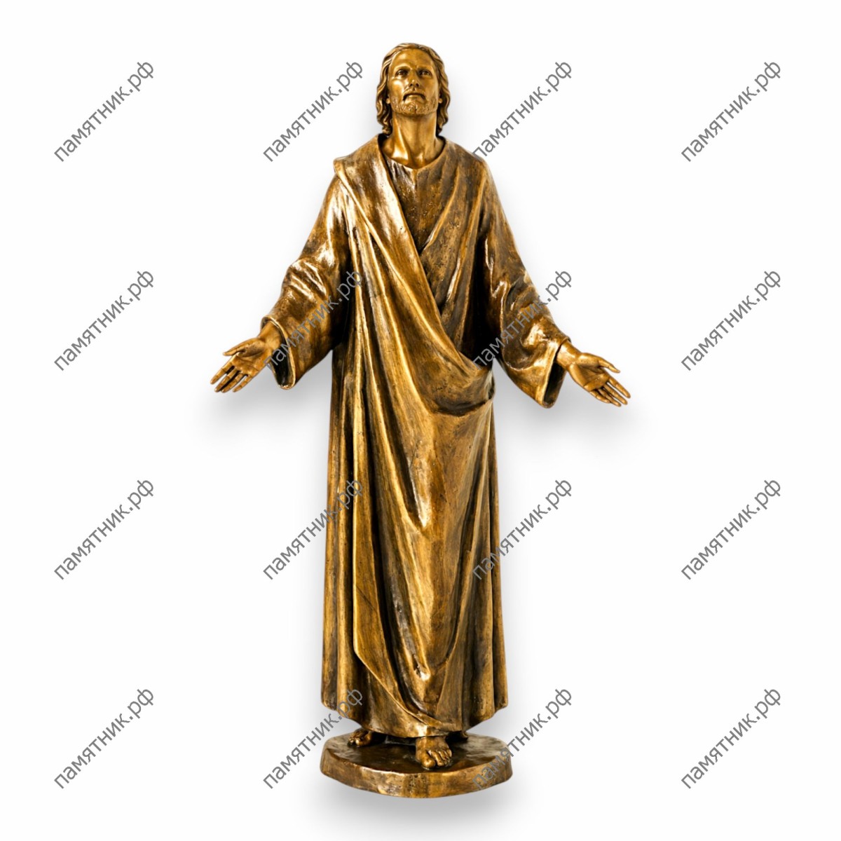 Величественный и гостеприимный образ всепрощающего Спасителя. Иисус с широко распахнутыми руками словно приглашает каждую душу найти утешение и вечный покой под Своим покровом. Монументальная стать, уверенный и спокойный лик, а также роскошная, глубокая драпировка одеяний демонстрируют вершину европейского литейного мастерства. Эта скульптура наполнит место упокоения атмосферой торжества вечной жизни.