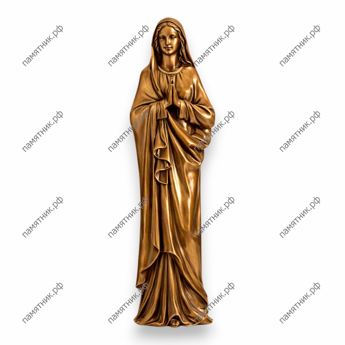 Каноническое воплощение небесной чистоты и духовного заступничества. Дева Мария, застывшая в искренней молитве со сложенными руками, излучает невероятное умиротворение и материнское тепло. Традиционная, глубокая драпировка мантии подчеркивает классическую строгость и величественность фигуры. Эта безупречная работа итальянских литейщиков станет символом вечной памяти и надежным духовным стражем.