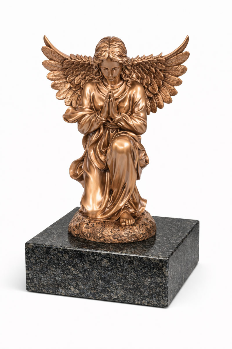 Коленопреклоненный ангел в молитве. Скульптура СПБ-11 — это величественный и одухотворенный образ небесного посланника. Ангел запечатлен опустившимся на одно колено, со сложенными в искренней молитве руками и слегка склоненной головой. Его роскошные, детально проработанные крылья распахнуты за спиной, словно укрывая место захоронения от мирских тревог. Эта фигура символизирует вечную, непрестанную молитву за душу усопшего и выражает высшую степень благоговения и светлой памяти.