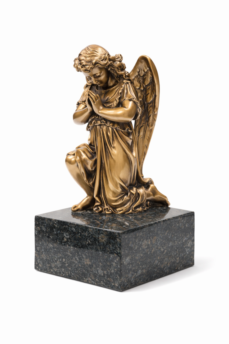 Молящийся ангел-младенец. Модель СПБ-16 представляет собой глубоко трогательную композицию молящегося херувима. Маленький ангел опустился на колени, искренне сложив ладони перед грудью и склонив кудрявую голову. Великолепная пластика фигурки и ювелирная точность отливки (каждая складка ткани и каждое перышко на крыльях выглядят максимально естественно) делают эту статуэтку настоящим произведением искусства. Это символ светлой, чистой души и безусловной родительской любви.