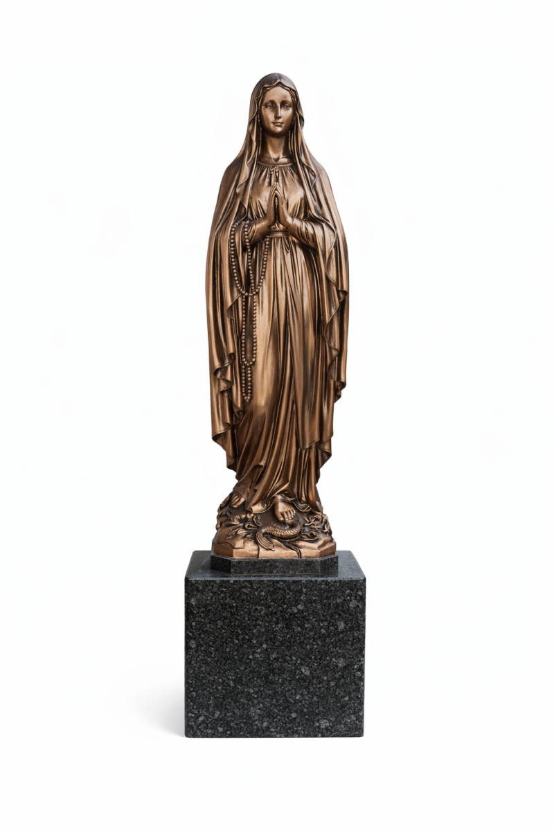 Богоматерь с розарием, попирающая змея. Модель СПБ-4 представляет собой глубоко символичную композицию. Дева Мария изображена в молитве, с перекинутым через руки католическим розарием (четками). Ее ноги стоят на каменном основании, попирая змея — библейский символ победы над грехом и злом. Великолепная детализация каждого элемента (от бусин четок до чешуи змея) делает эту скульптуру настоящим шедевром, подчеркивающим непоколебимую веру.